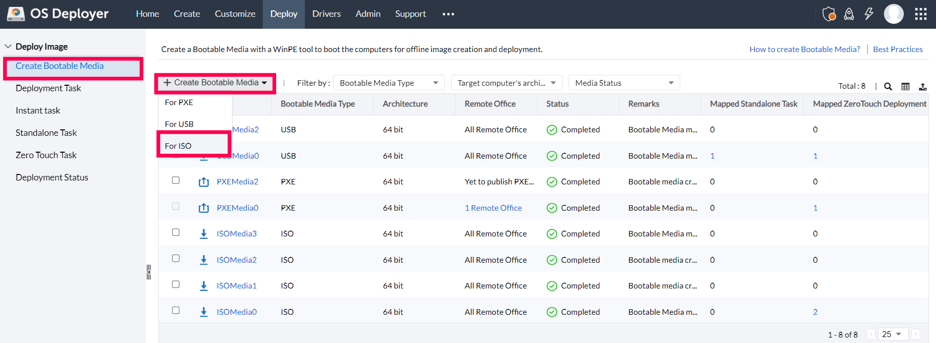 Sí, la ISO de Windows 10 es arrancable y se puede montar en una unidad USB o DVD para crear un medio de instalación y arrancar los sistemas necesarios. Para una distribución fluida de Windows 10 en todos los endpoints de su empresa desde una única consola, consulte las funciones de OS Deployer.