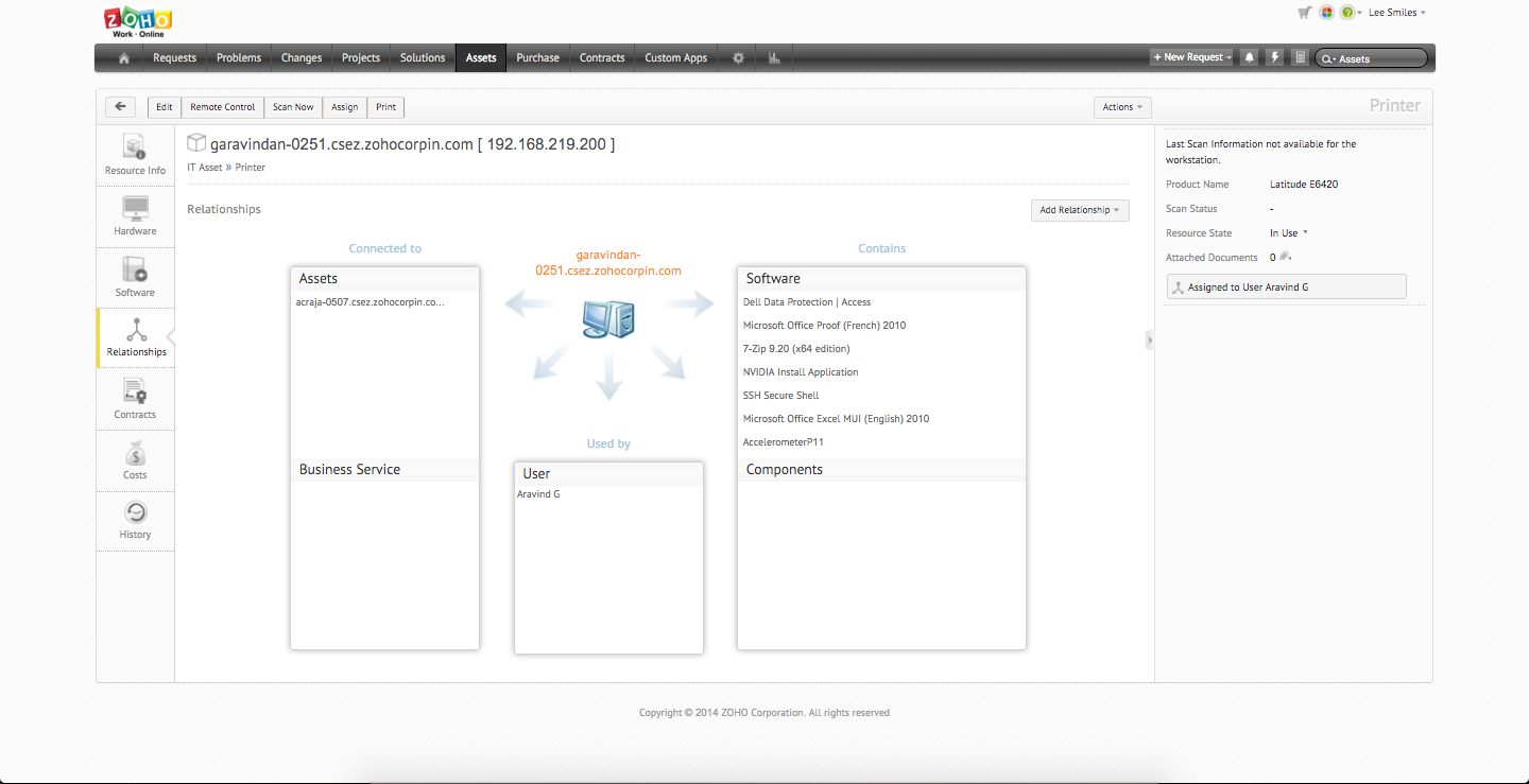 • Obtenga información completa de los activos como especificaciones del hardware, software instalado, historial de escaneo, historial de propiedad de los activos, y estado de los activos en un único panel.