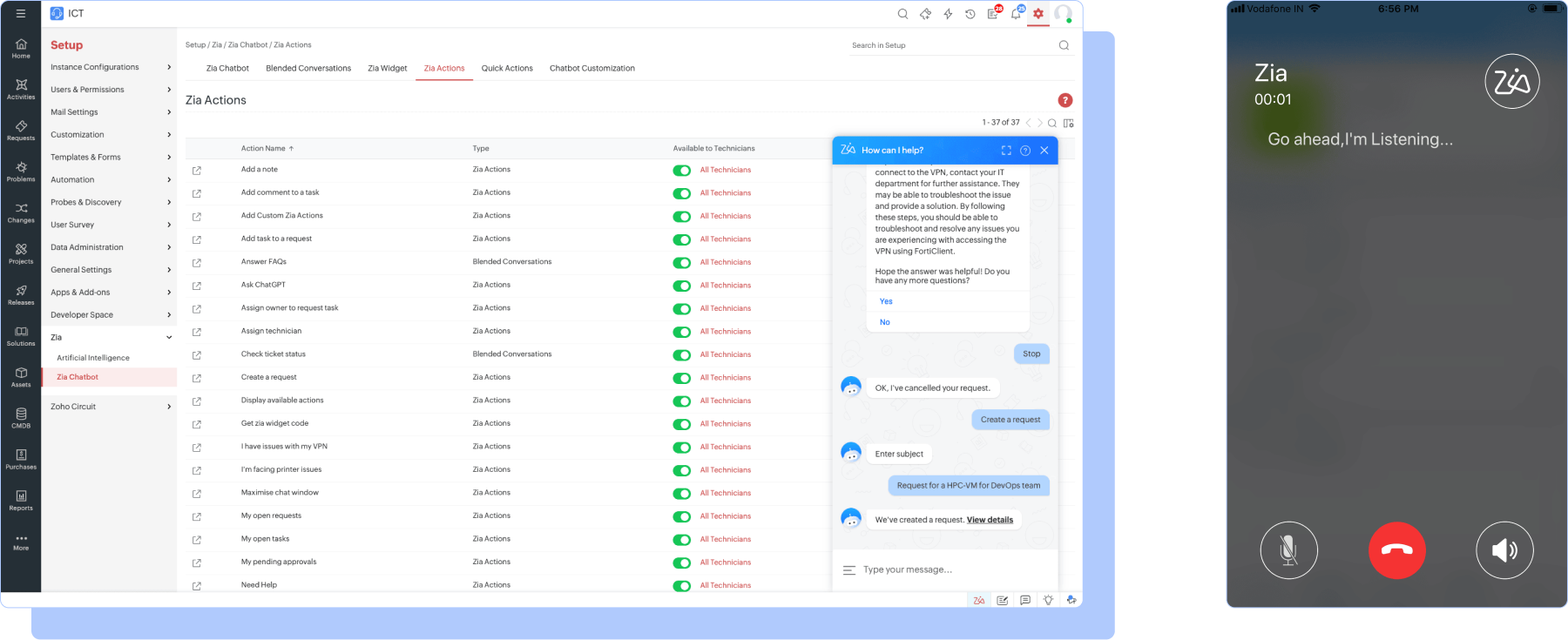 Aproveche la consola de desarrollo de código bajo de Zia para crear acciones personalizadas en Zia como preguntas y respuestas directas, extracción de datos y actividades de la mesa de servicio que se realizan sin navegar por la aplicación.