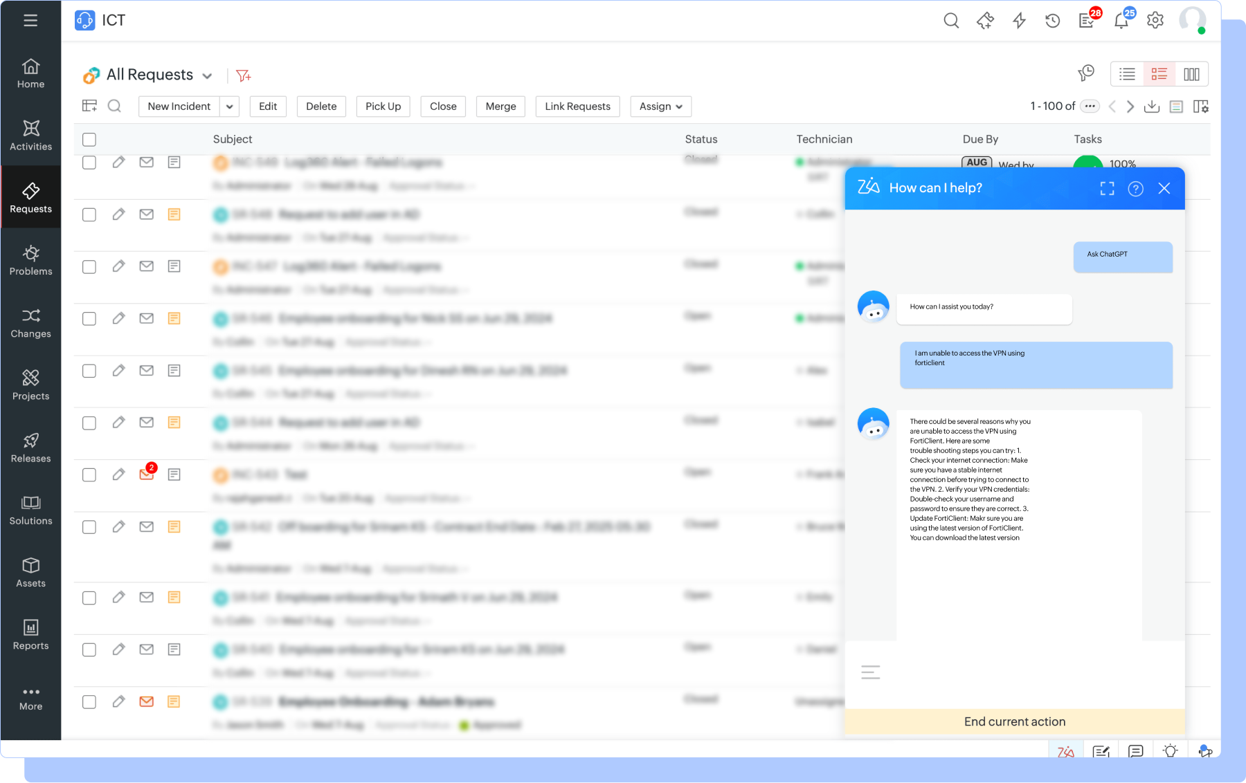 ServiceDesk Plus se integra con ChatGPT de OpenAI, lo que permite a los usuarios acceder al LLM desde Zia. Tanto los usuarios finales como los técnicos pueden acceder a conocimientos externos de forma segura y resumir los tickets en Microsoft Teams, lo que aumenta la productividad en el lugar de trabajo.