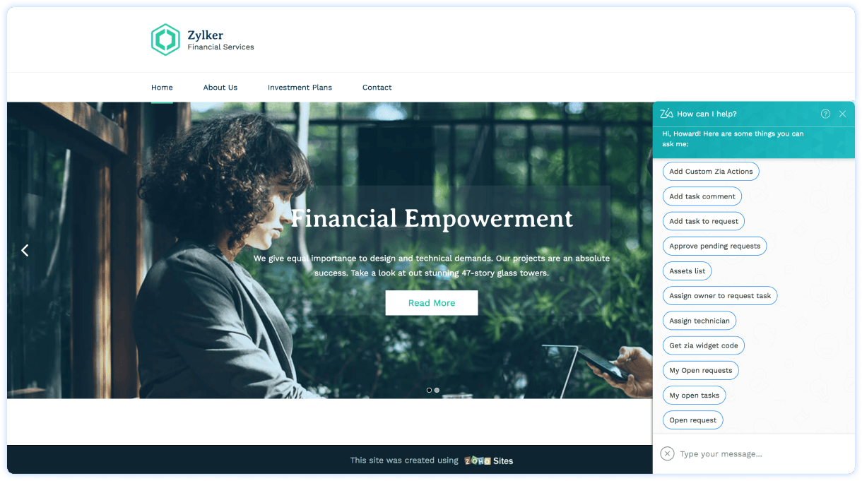 Habilite el agente virtual nativo en todas las mesas de servicio, incluyendo Recursos Humanos e Instalaciones. También puede incrustar Zia como widget en sus sitios web o páginas de intranet, personalizándolo para adaptar su marca y sus mensajes.