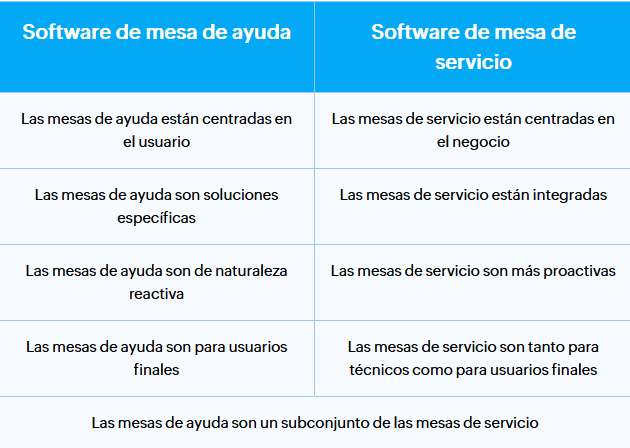A pesar de que la mesa de servicio es más integral que la de ayuda, las dos se especializan en brindar soporte de nivel 1. L a gran diferencia entre ambas yace en a quién responde. Por un lado, la mesa de ayuda atiende incidentes y solicitudes de usuarios finales. Es explícitamente externa. Por otro lado, la mesa de servicio opera a nivel interno. Ya que solucionar problemas normalmente supone interactuar con la infraestructura física y/o digital, debe ser proactiva e integral.