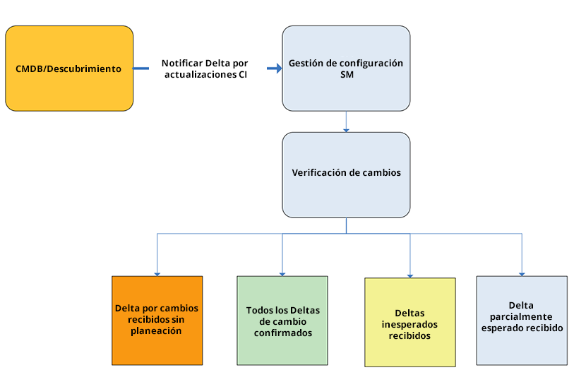 El equipo organizó talleres con los equipos de infraestructura, desarrollo de software de aplicación y gestión para decidir los procesos de configuración, cambio y liberación. A continuación se muestra el flujo conceptual acordado, desde la perspectiva de la herramienta.