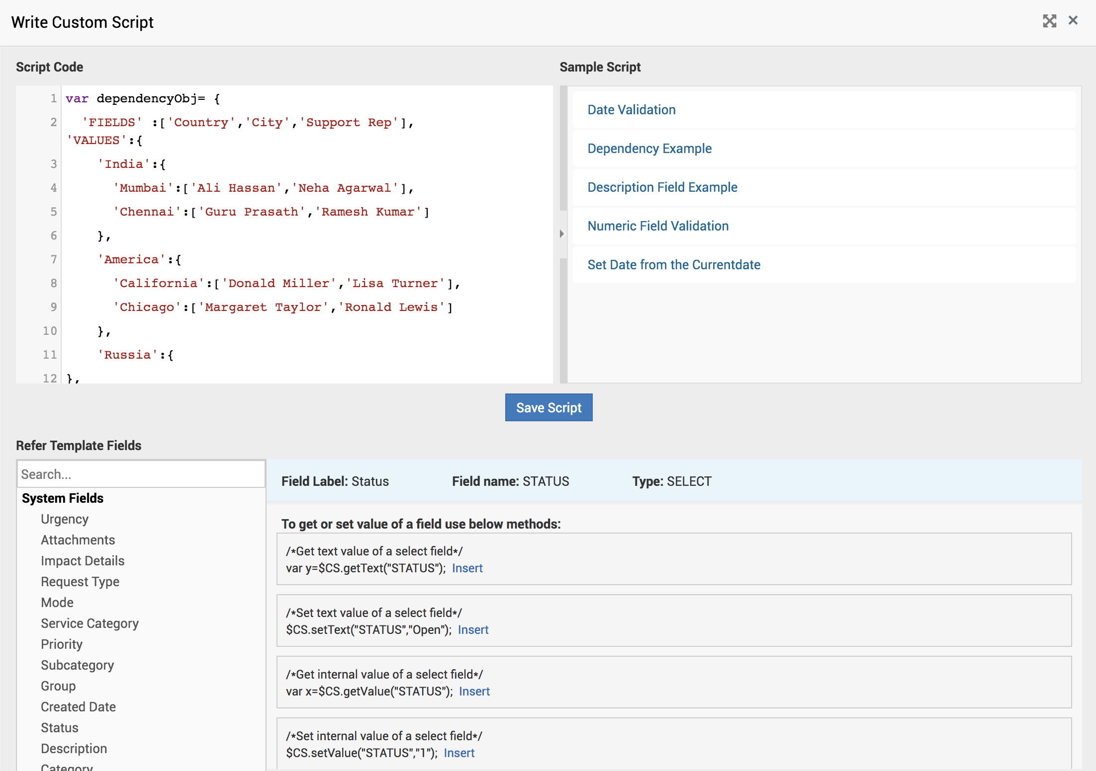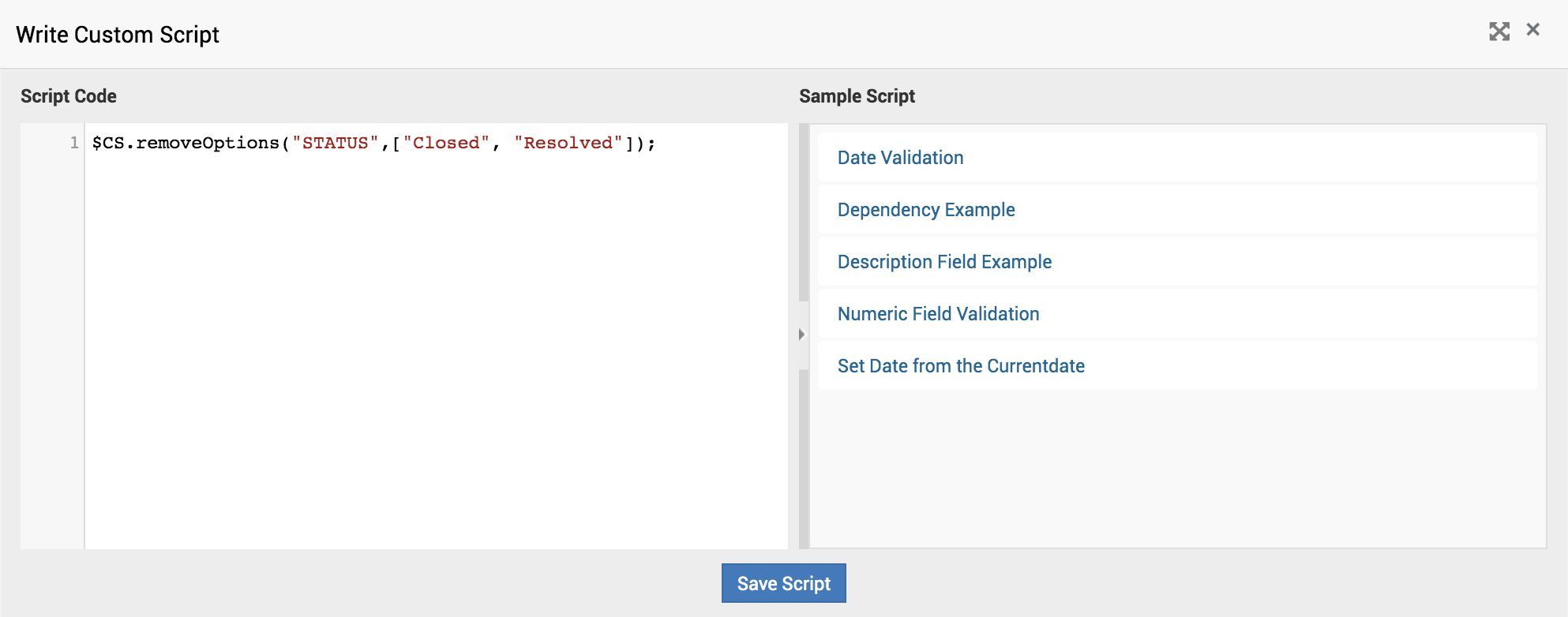 - Elimine los estados "Resuelto" y "Cerrado" del campo Estado usando Script personalizado, como se muestra en la siguiente imagen.