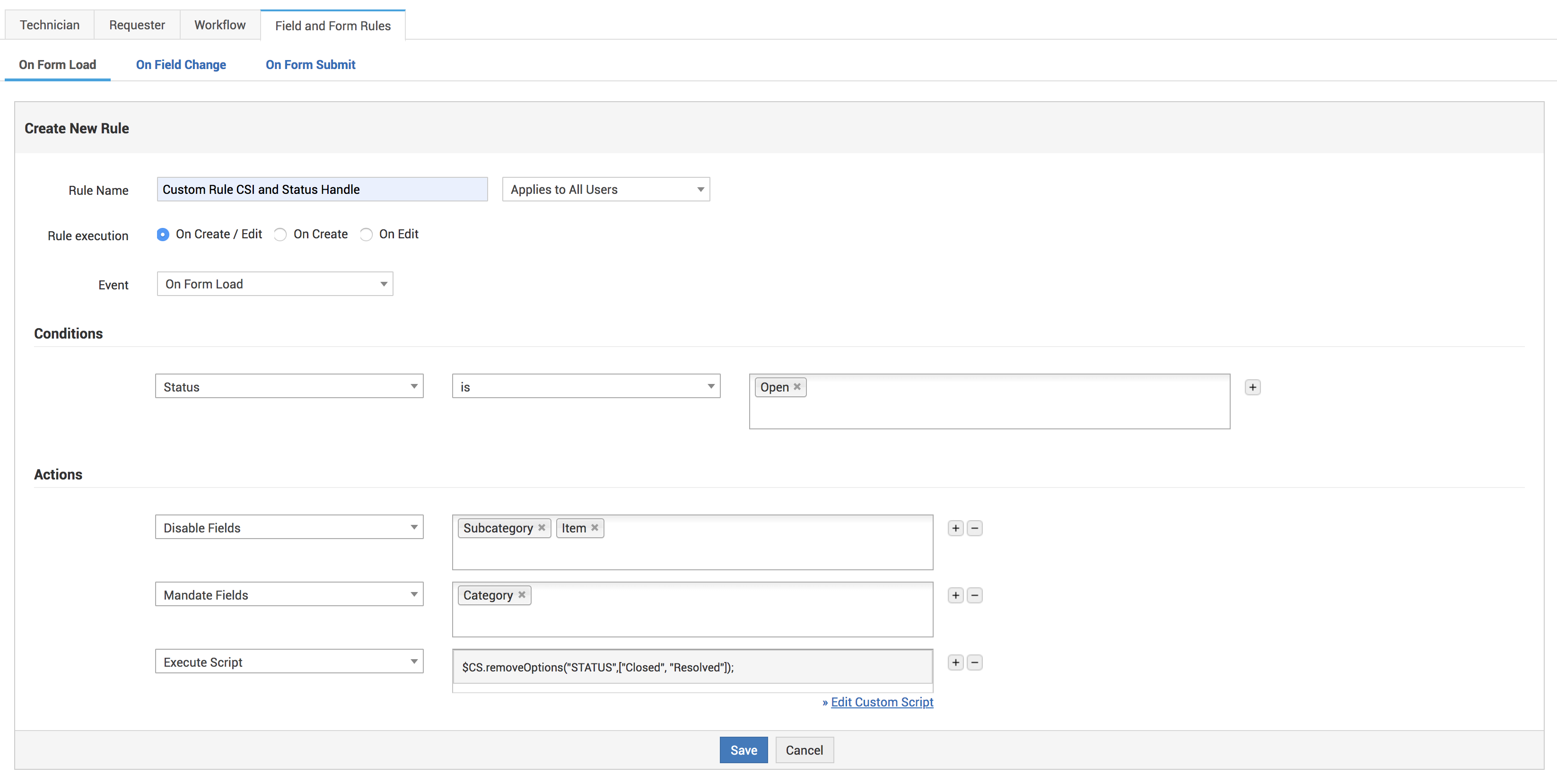 - Agregue otra acción como Ejecutar script y agregue el código del script para eliminar las opciones "Cerrado" y "Resuelto" del campo Estado.