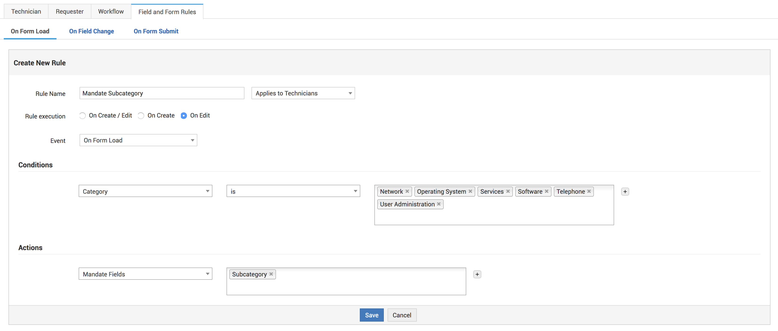 - Cree una nueva regla en el "evento Al cargar el formulario" (por ejemplo, hacer obligatoria la subcategoría).