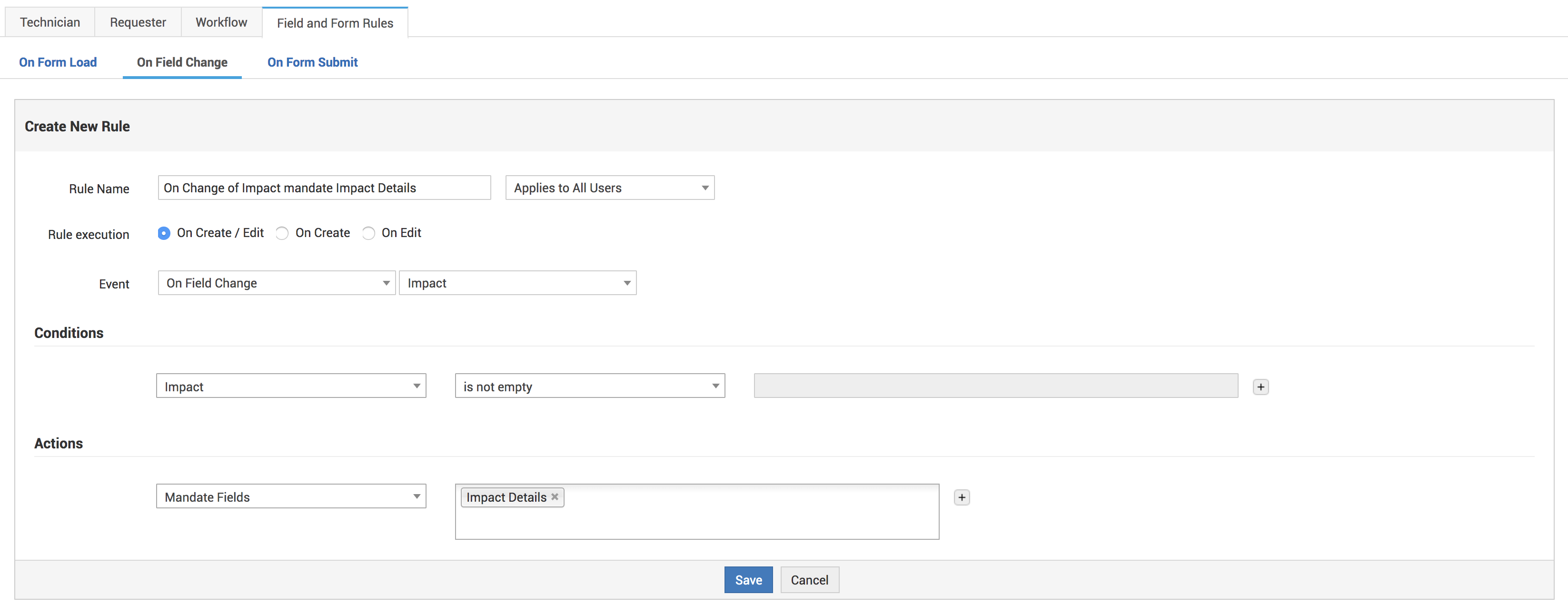 - Cree una nueva regla en el evento "Al cambiar el campo" (por ejemplo, "al cambiar impacto, hacer obligatorios los detalles del impacto") .