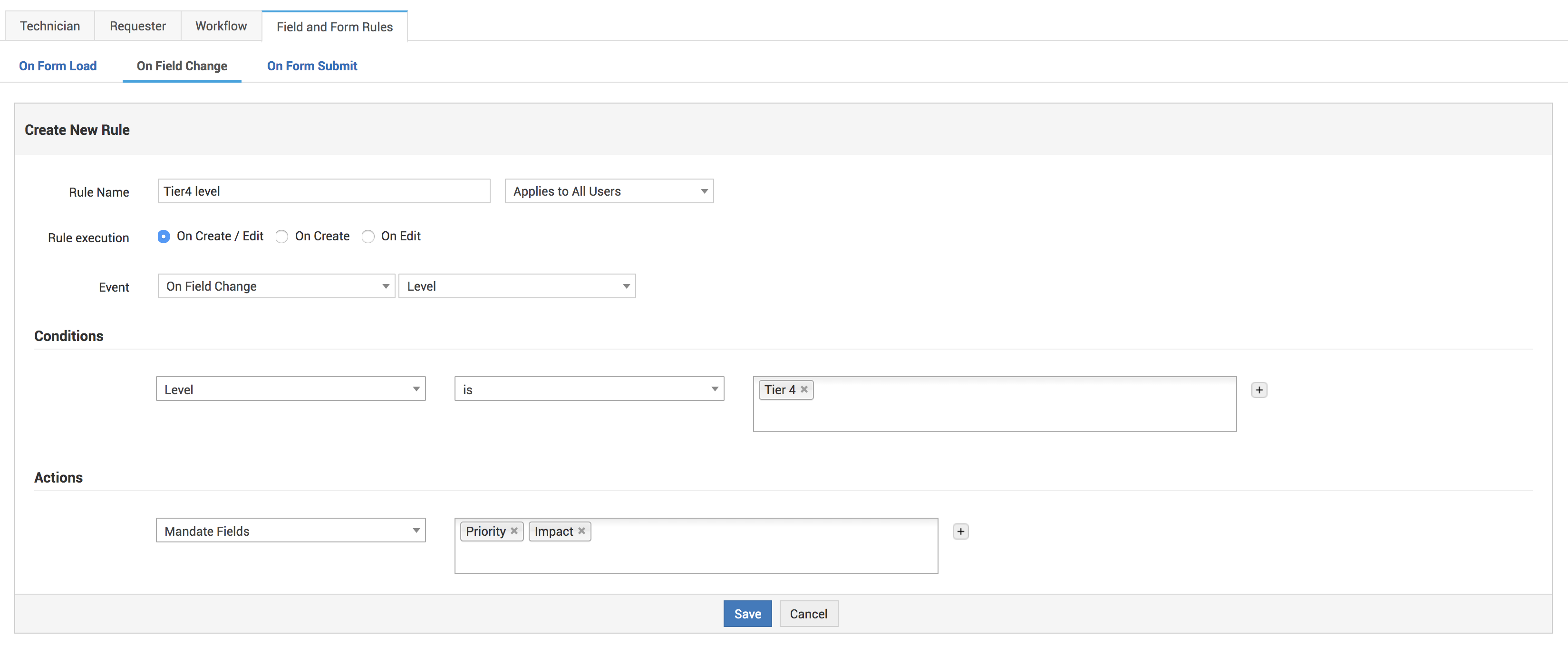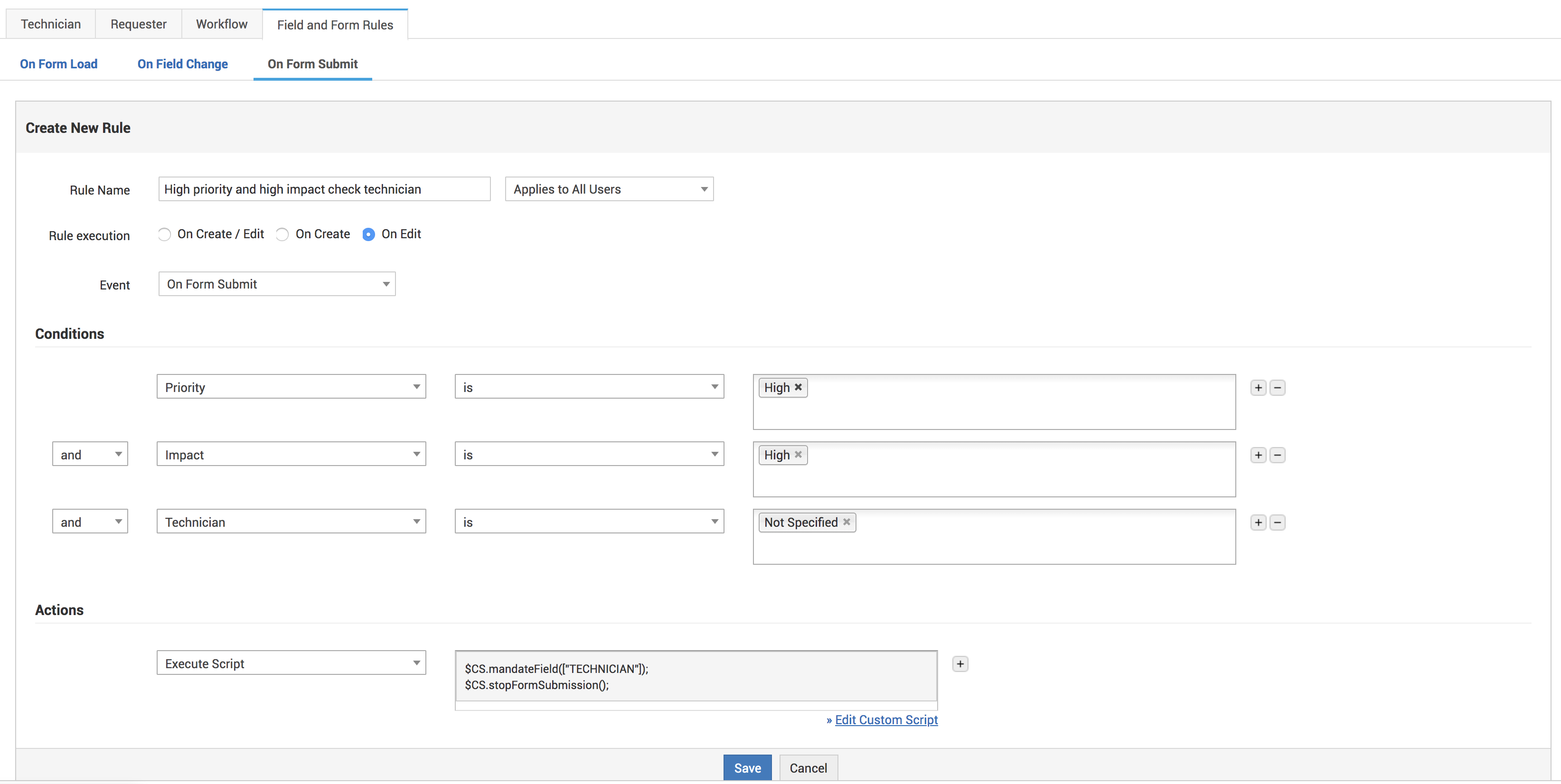 - Cree una nueva regla en el evento "Al enviar el formulario" (por ejemplo, "verificar técnico para prioridad alta e impacto alto")