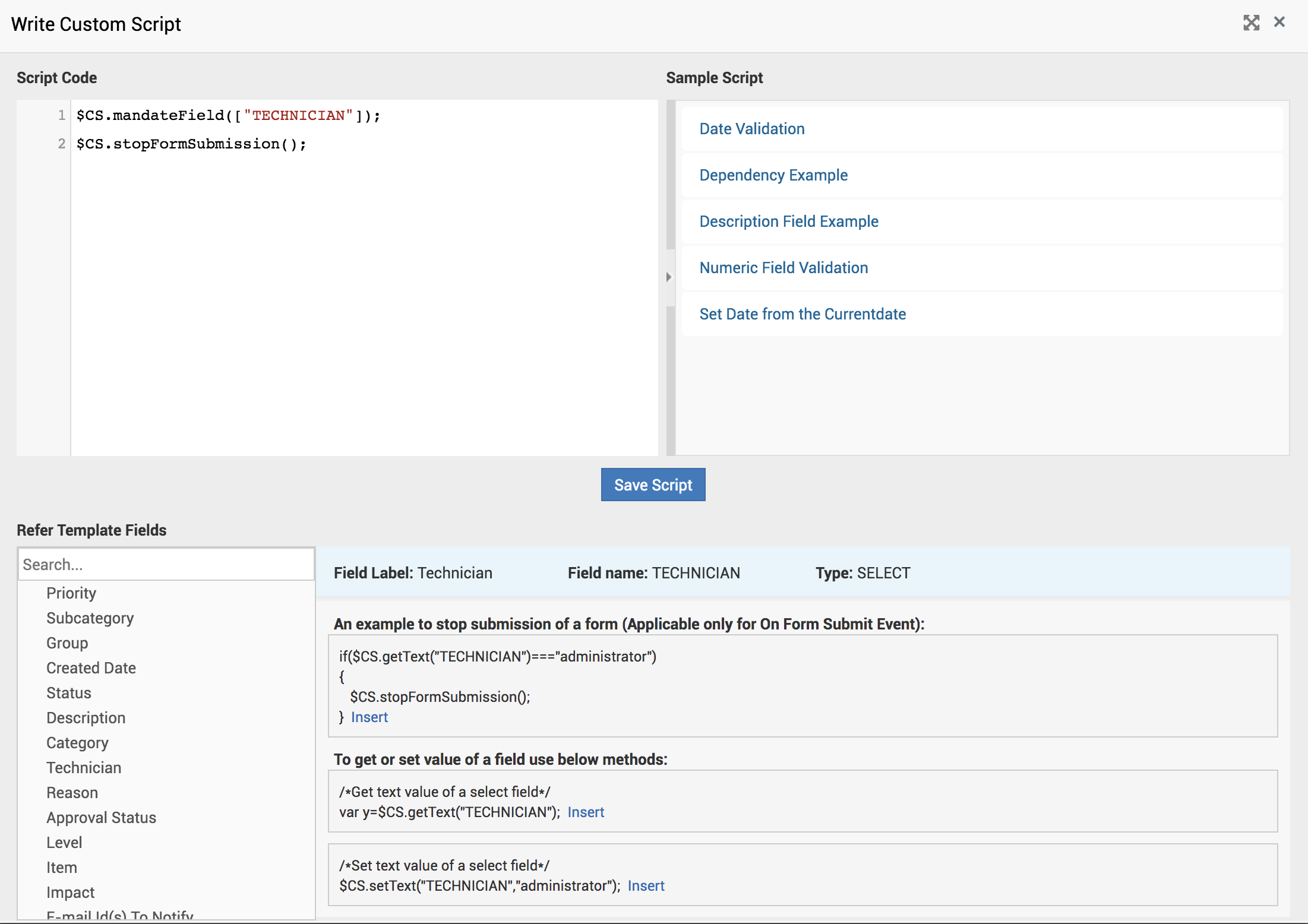 - Escriba un script para hacer obligatorio el campo Técnico y detener el envío del formulario, como se muestra en la siguiente imagen.
