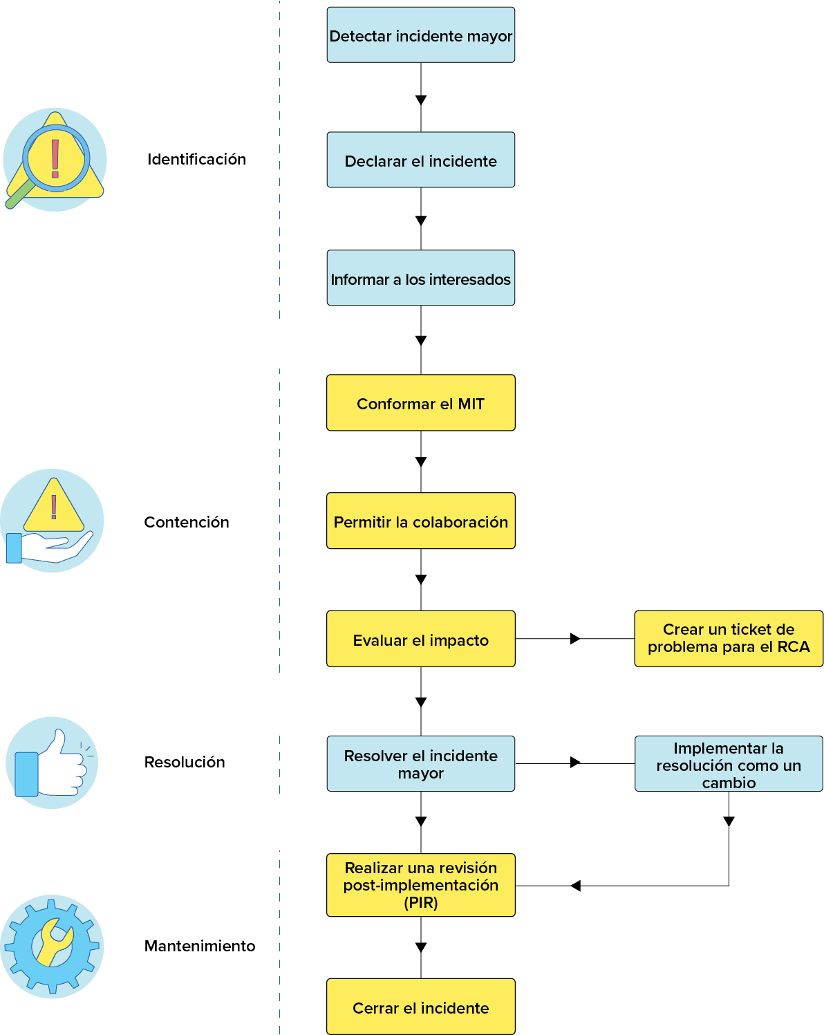 Las organizaciones deben tener un proceso de MIM, ya que les ayuda a minimizar el impacto comercial que causa un incidente mayor. El proceso de MIM consiste principalmente en los siguientes pasos: