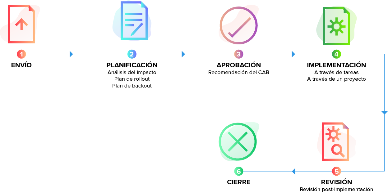 Establecer un proceso sistemático de gestión de cambios ayuda a su organización a implementar los cambios sin incidentes y con una alta tasa de éxito.