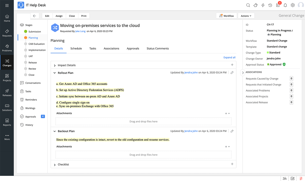 A continuación, el iniciador del cambio agrega la información del cambio, como el motivo del cambio, información detallada sobre su impacto, los planes de rollout y backout, y el tiempo de inactividad programado. El iniciador de cambios también agrega todos los incidentes y problemas asociados para realizar un mejor seguimiento del cambio y su impacto. A continuación se detallan los diversos planes que ideó el iniciador del cambio.