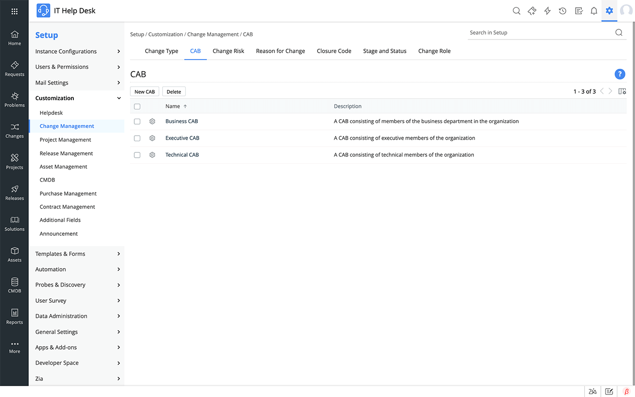 Luego, el plan de cambio debe ser aprobado por el comité asesor de cambios (CAB), el comité asesor de cambios de emergencia (ECAB) y cualquier otra autoridad que tenga interés en el cambio o en la infraestructura organizacional afectada por el cambio. Crear CAB personalizados ayuda a las organizaciones a agrupar el personal relevante para gestionar fácilmente las aprobaciones. Automatizar el proceso de aprobación acelera todo el cambio y garantiza que no se pasen por alto las solicitudes de aprobación.