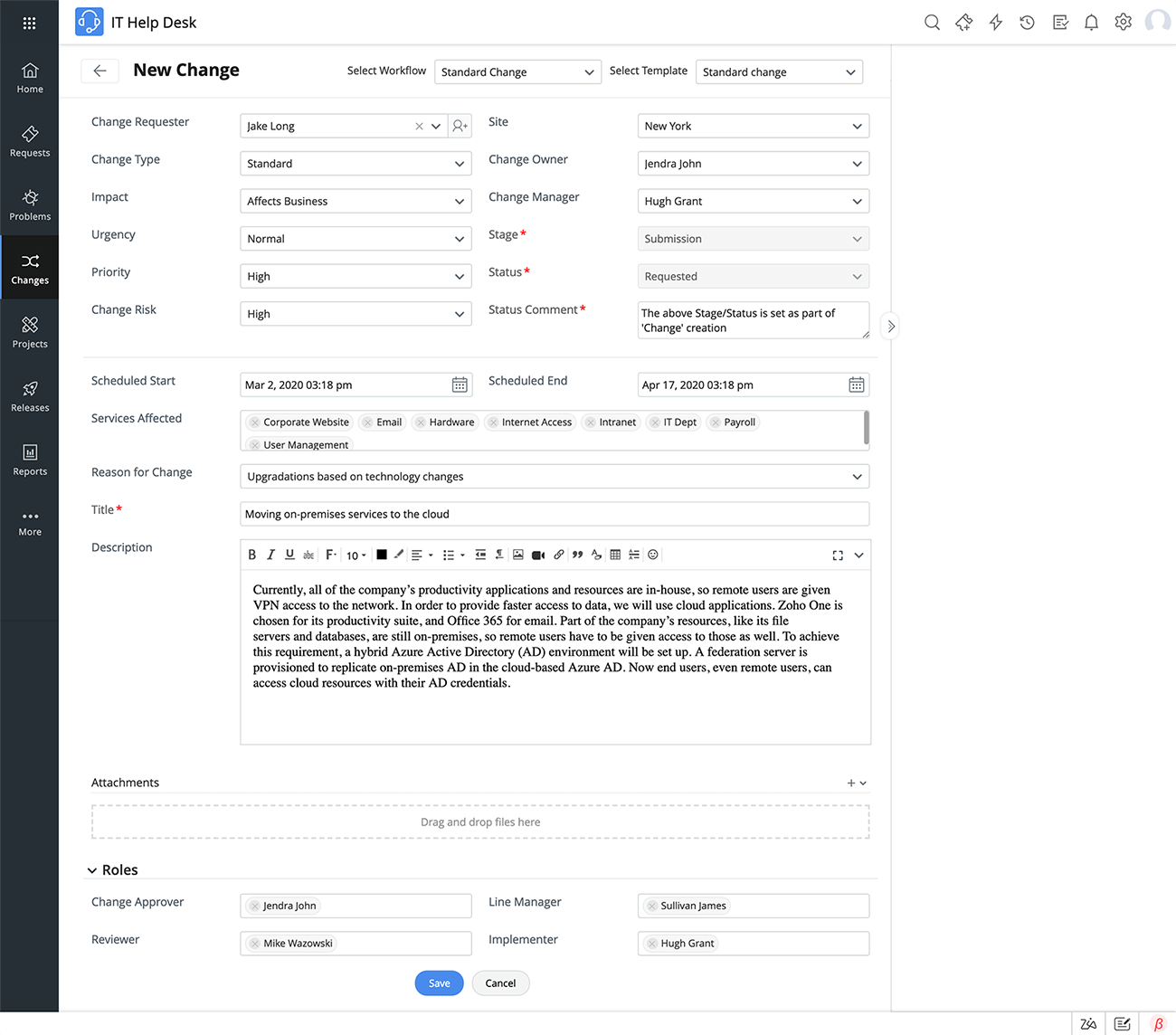 - Involucre a las partes interesadas adecuadas, como el propietario del cambio, el aprobador, el gerente de línea, el revisor del cambio, usando los roles de cambio.