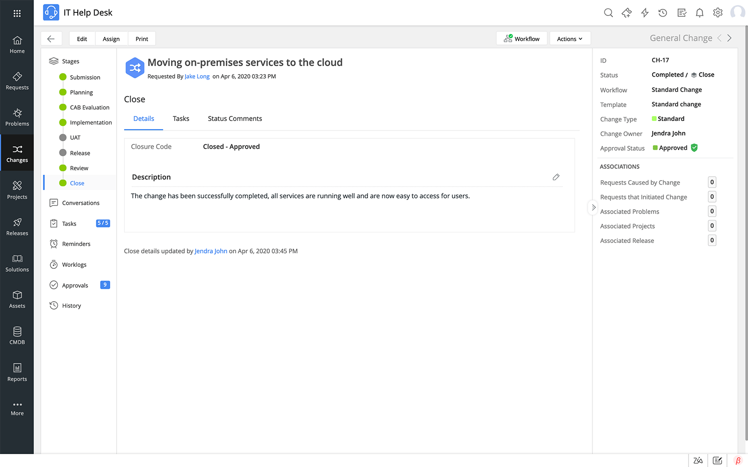 Finalmente, el cambio se cierra y se asigna un código de cierre basado en la naturaleza del cierre del cambio.