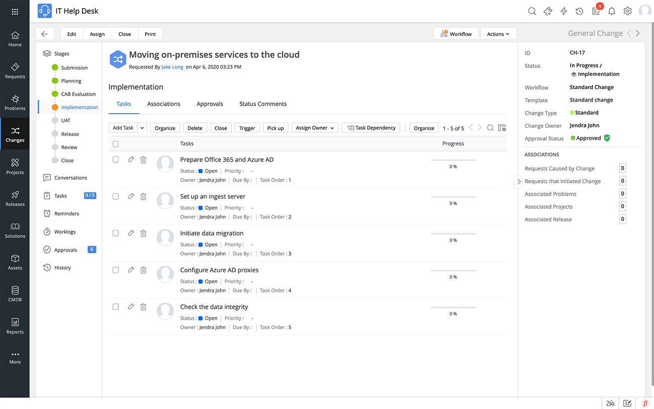 Zylker utiliza tareas para controlar la implementación. Las tareas se asignan a diferentes técnicos, y las dependencias establecen el orden en que se deben realizar las tareas. El propietario del cambio puede controlar fácilmente el progreso de la implementación del cambio y gestionar las tareas en un solo lugar.