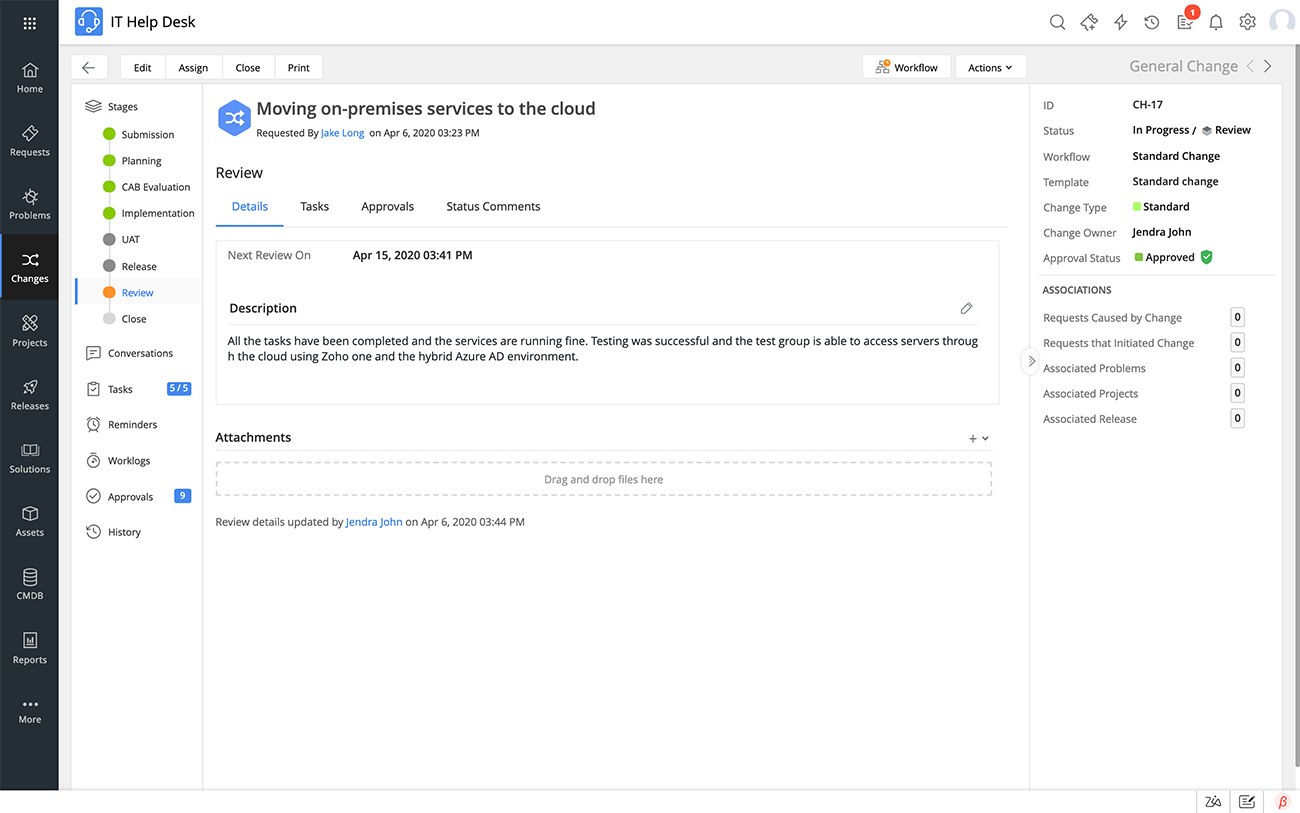Al controlar todo el proceso de cambios, la gestión de cambios permite a las organizaciones mantenerse al tanto de todas las solicitudes de cambios. También facilita la identificación y reducción de los cambios no autorizados. Al permitir que los usuarios envíen una solicitud de cambio (RFC) solo a través de la herramienta de la mesa de servicio, las organizaciones pueden recopilar toda la información necesaria sobre el cambio desde el principio y luego decidir si realmente es necesario implementar el cambio. Un mecanismo de aprobación robusto garantiza que los cambios reciban todos los permisos necesarios antes de su implementación.