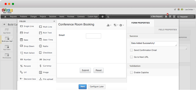 • Añada lógicas de aplicación con Deluge, el lenguaje de scripting en línea fácil de aprender y que está integrado con Zoho Creator.
