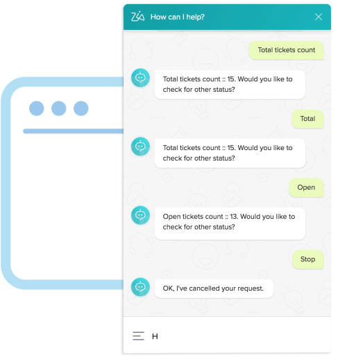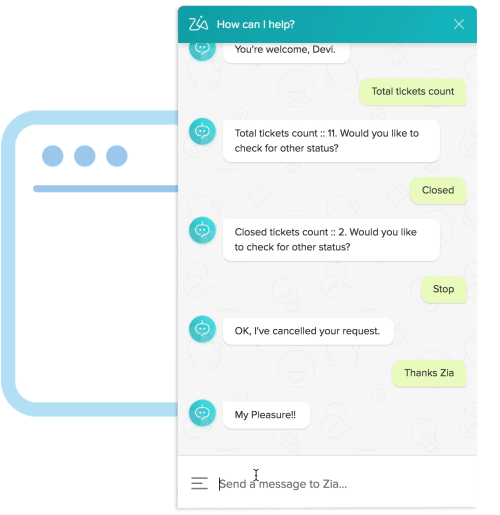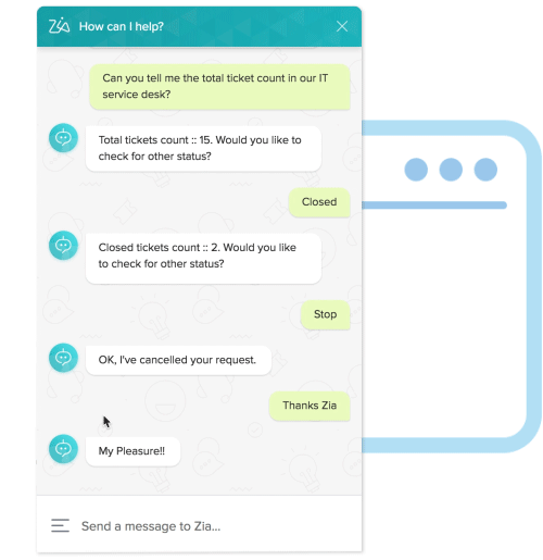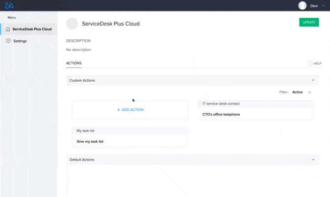 Permite a los equipos de la mesa de servicio crear e implementar acciones personalizadas de Zia, que van desde respuestas directas hasta acciones de invocación en herramientas de terceros como JIRA.