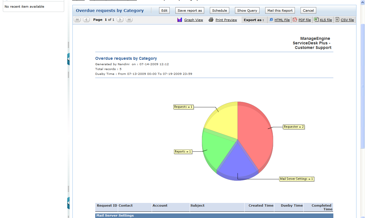 - SupportCenter Plus le proporciona 50 informes incorporados que le dan acceso inmediato a diferentes informes basados en solicitudes, prioridades, categorías, SLA, etc.