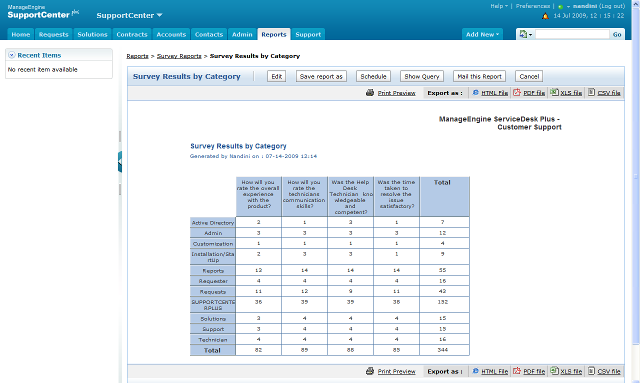 - SupportCenter Plus le proporciona 50 informes incorporados que le brindan acceso inmediato a diferentes informes basados en solicitudes, prioridad, categorías, SLA, etc.