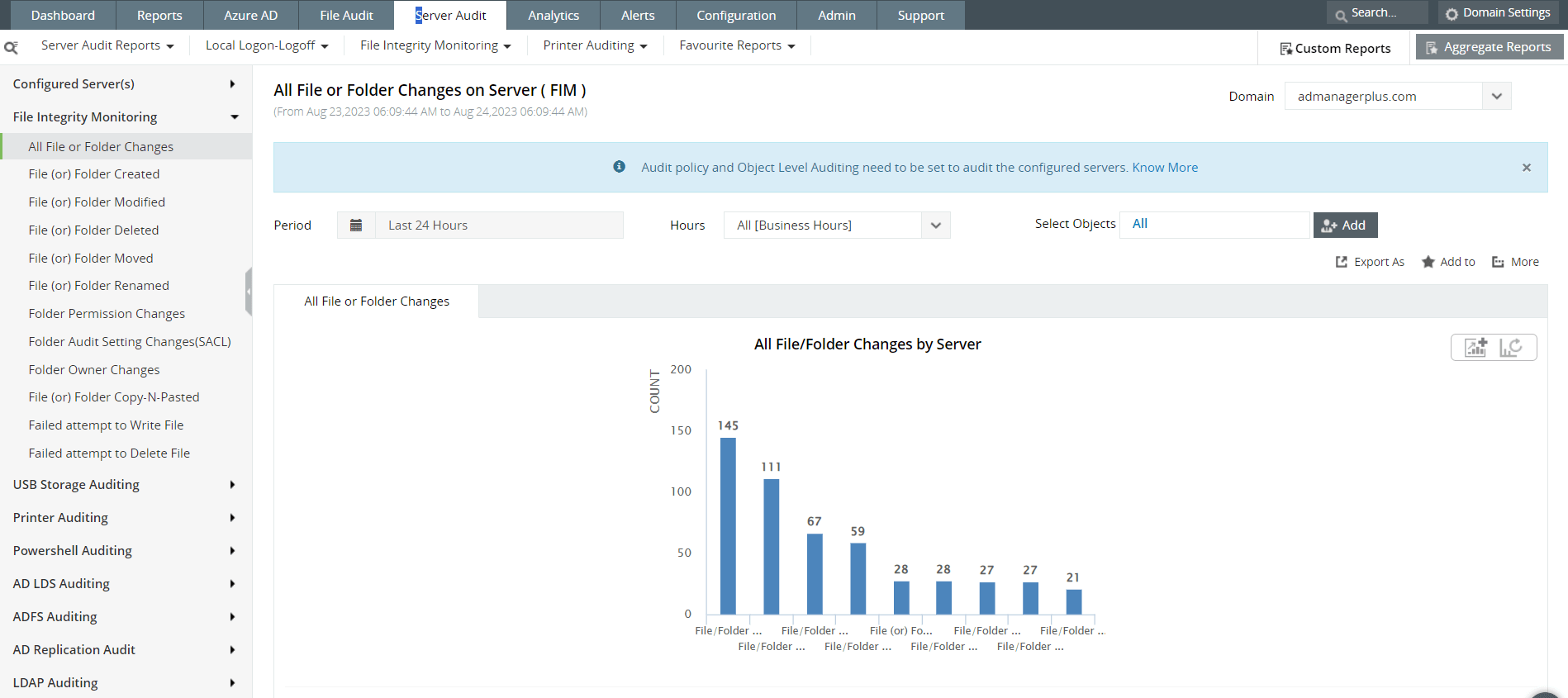 About the report: File integrity monitoring (FIM) reports help track any changes made to files or folders in workstations or devices in the network. Security admins and analysts can get detailed information about all file or folder changes including files or folders created, modified, deleted, moved, or renamed. There are specific reports that list out all folder permission changes, audit setting changes, folder owner changes, files or folders copy and pasted, and failed attempts to write or delete files.