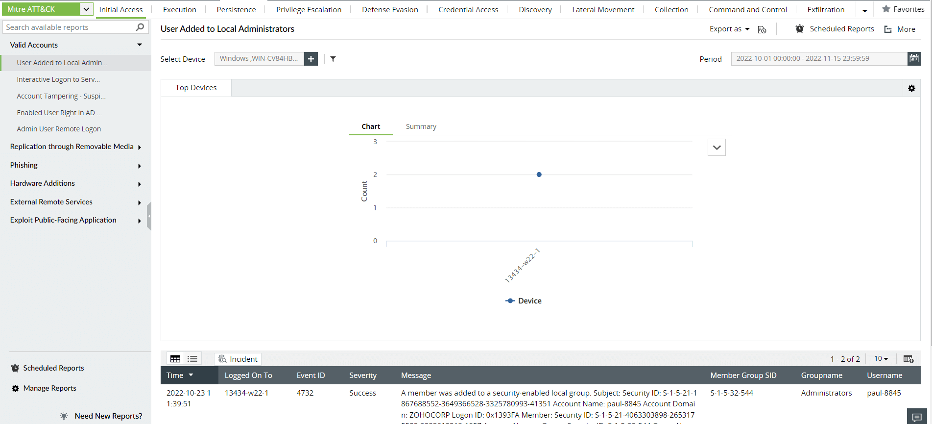 Figure 2: MITRE ATT&CK reports in Log360, ManageEngine's comprehensive SIEM solution