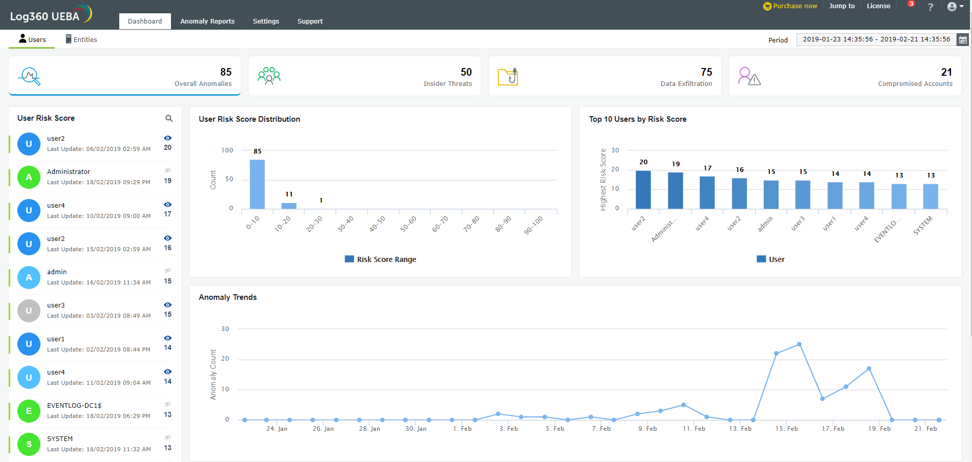 A large organization may face several internal threats, some very minor and others more dangerous. Log360’s UEBA dashboard features a score-based risk assessment to help you prioritize threats and determine which events actually merit investigation.