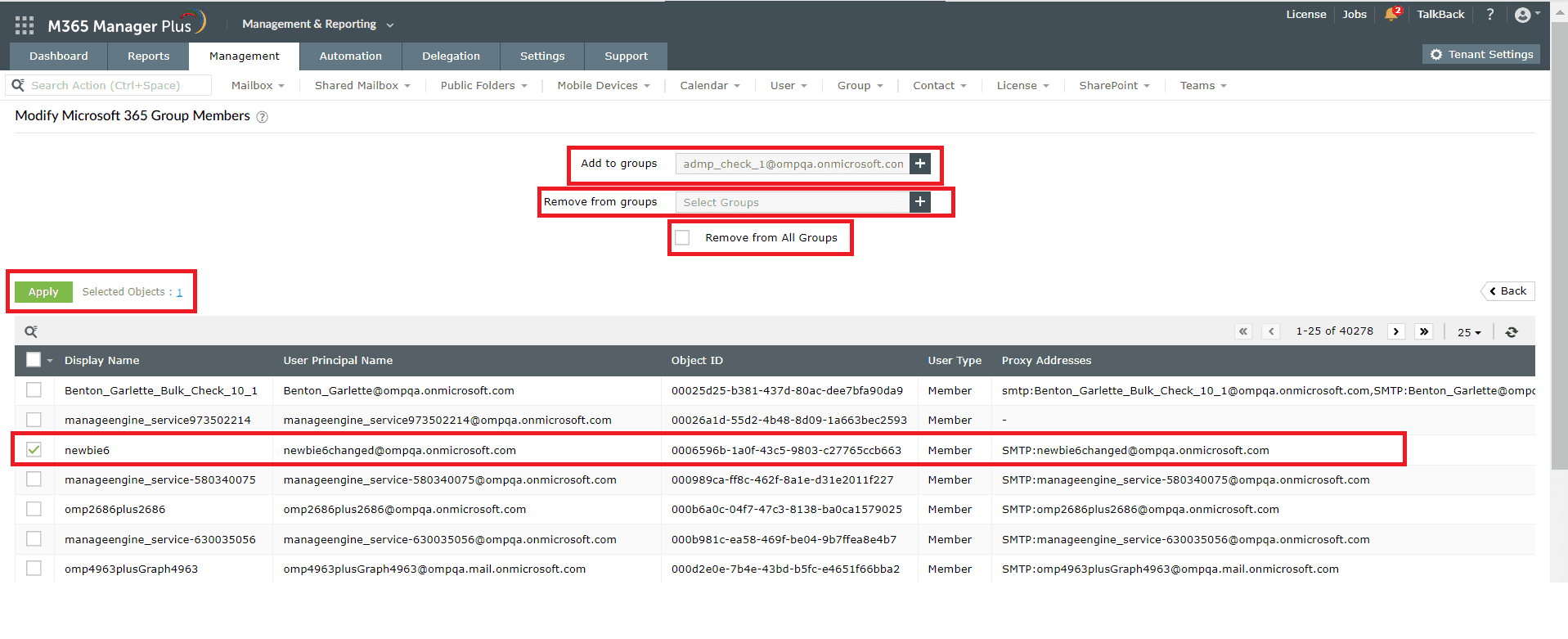 - Log in to M365 Manager Plus and navigate to the Management tab> Azure Active Directory > Group Management > Modify Microsoft 365 Group Members