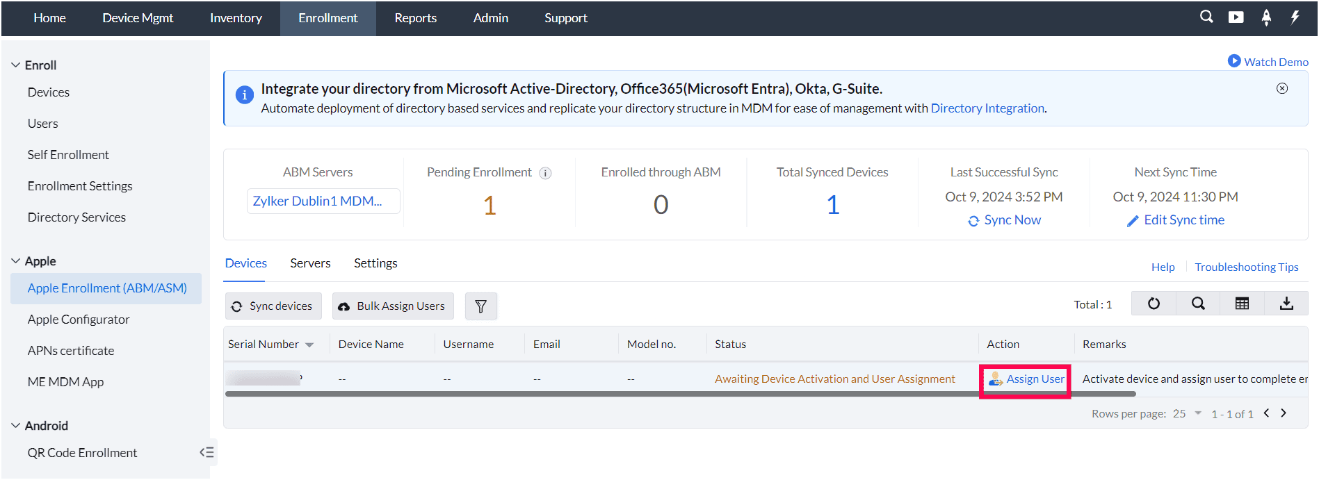 In order to complete enrollment, once the device is activated and enrolled into MDM, it needs to be assigned against a user. There are following scenarios: