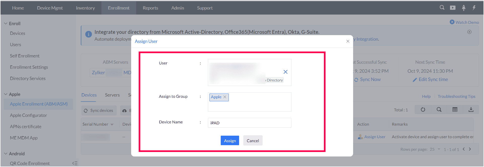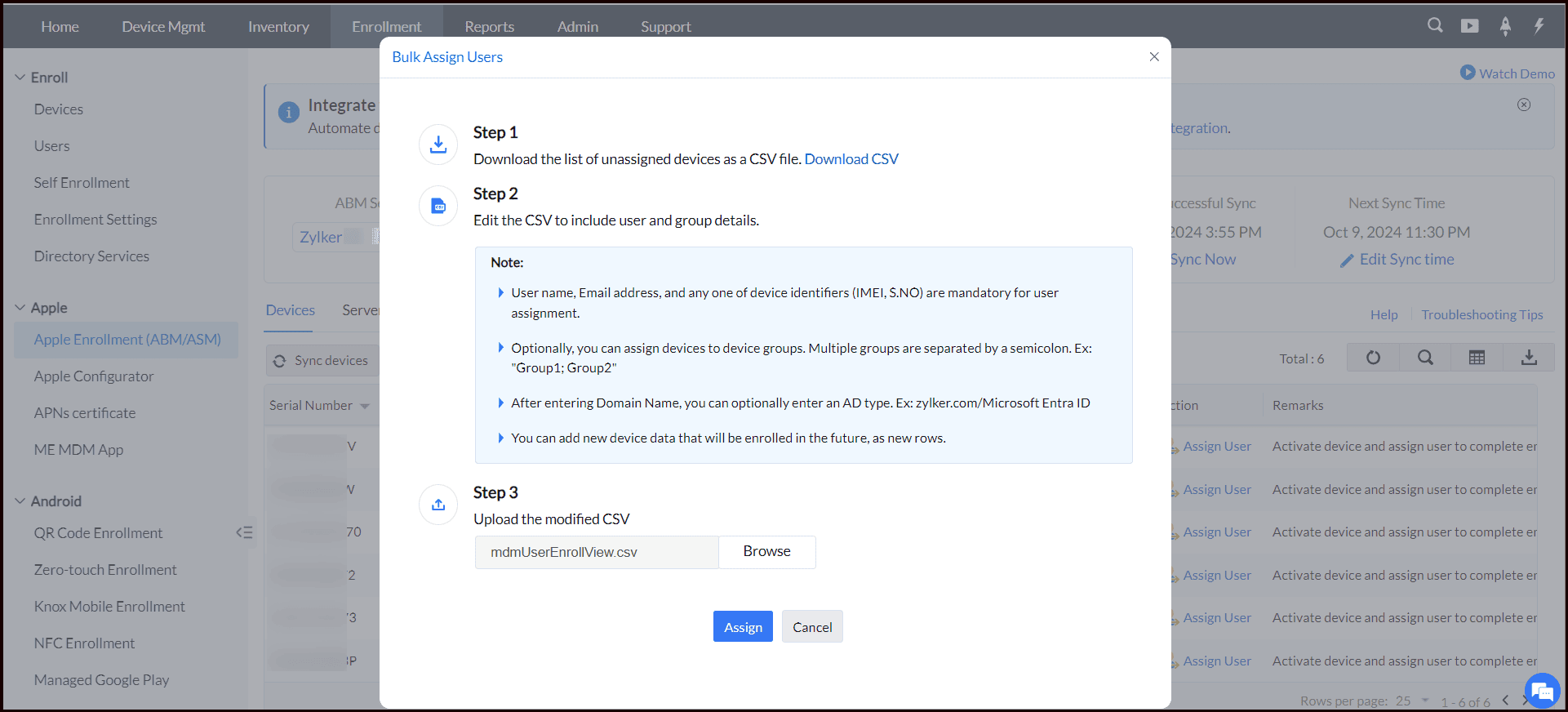 Log in to the MDM console. Then, go to Enrollment > Apple > Apple Enrollment (ABM/ASM) > Devices. From the list of devices, choose the device you want to assign to users. You can select multiple devices if needed. Choose Assignment Method: