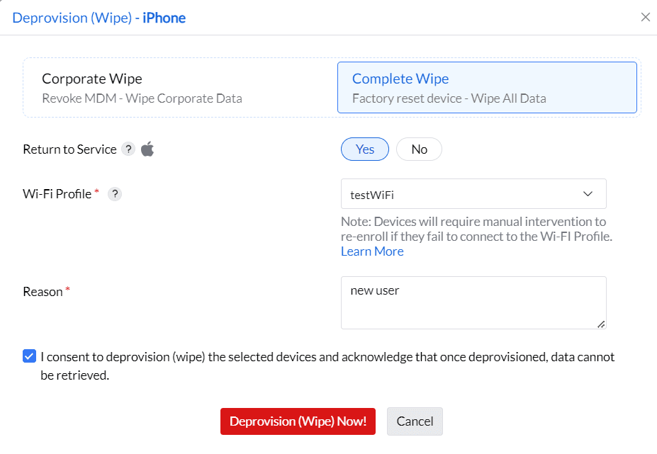 - Specify the reason for deprovisioning the devices and click Deprovision (Wipe) Now!