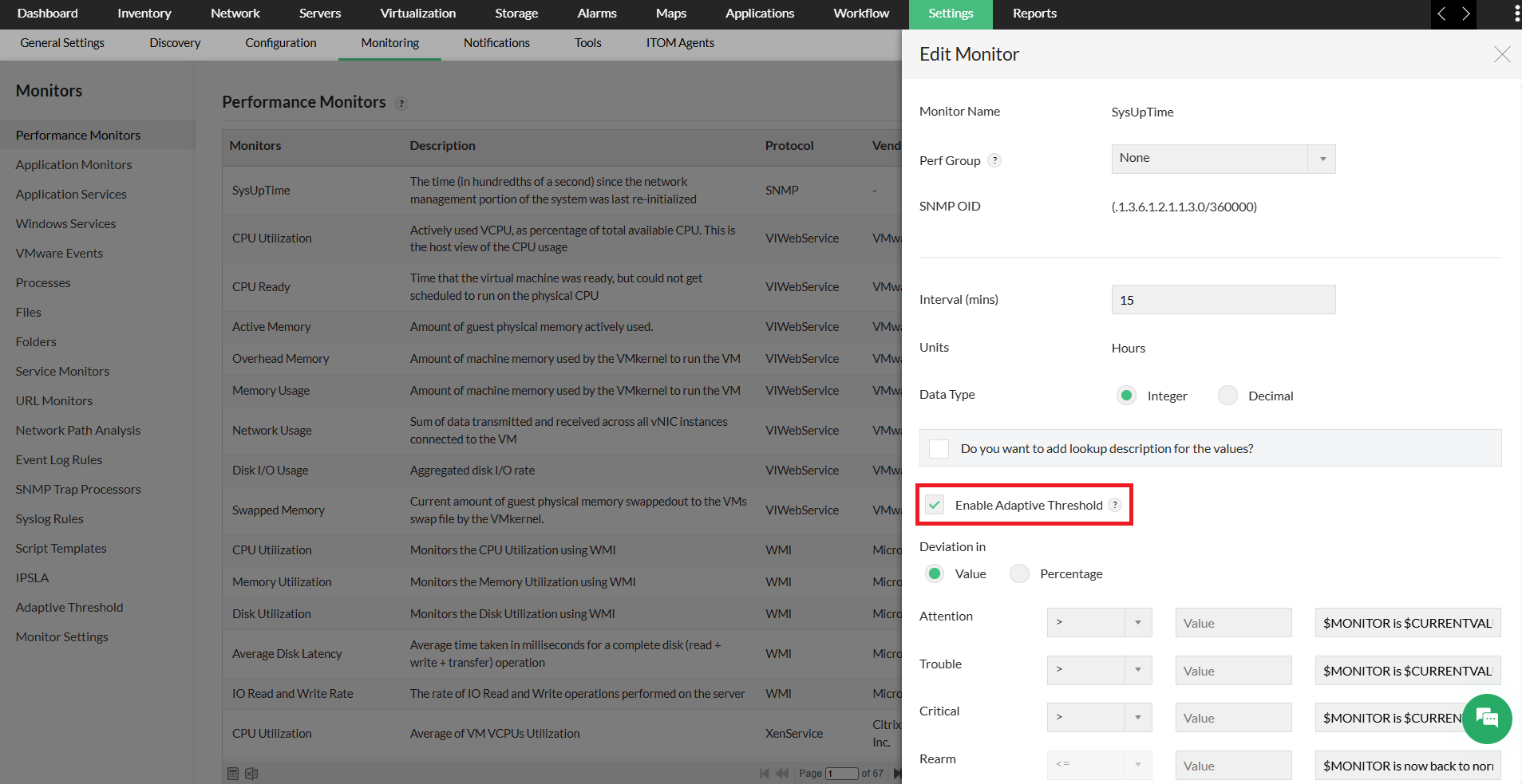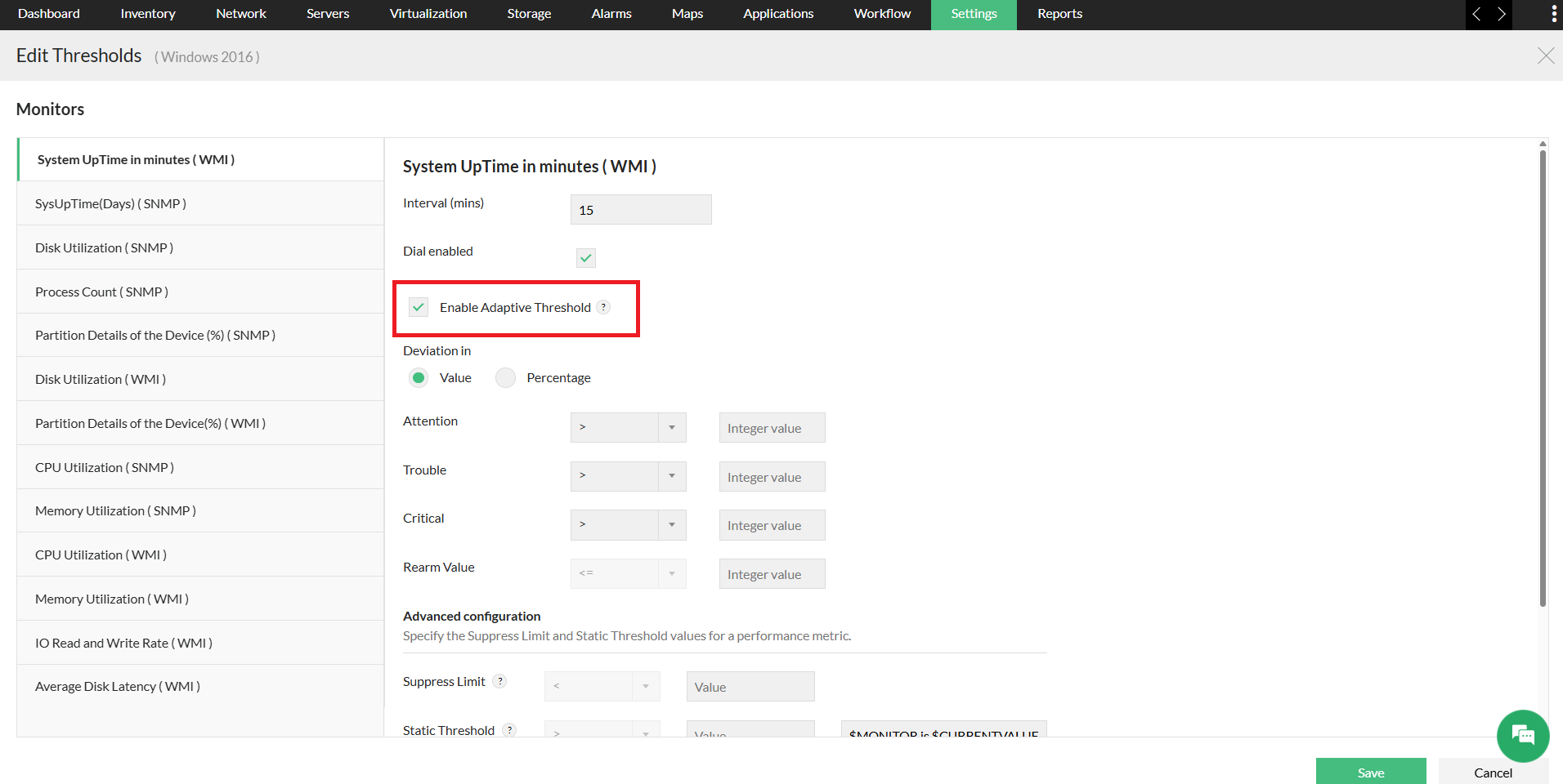 OpManager's Adaptive thresholds feature allows you to automate the threshold configuration process, with the help of AI and ML algorithms. So instead of manually combing through mountains of historical data and device usage patterns, you can now automate the threshold configuration process at the click of a button. Know more about how to configure adaptive thresholds in OpManager.