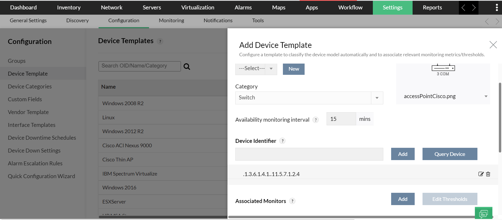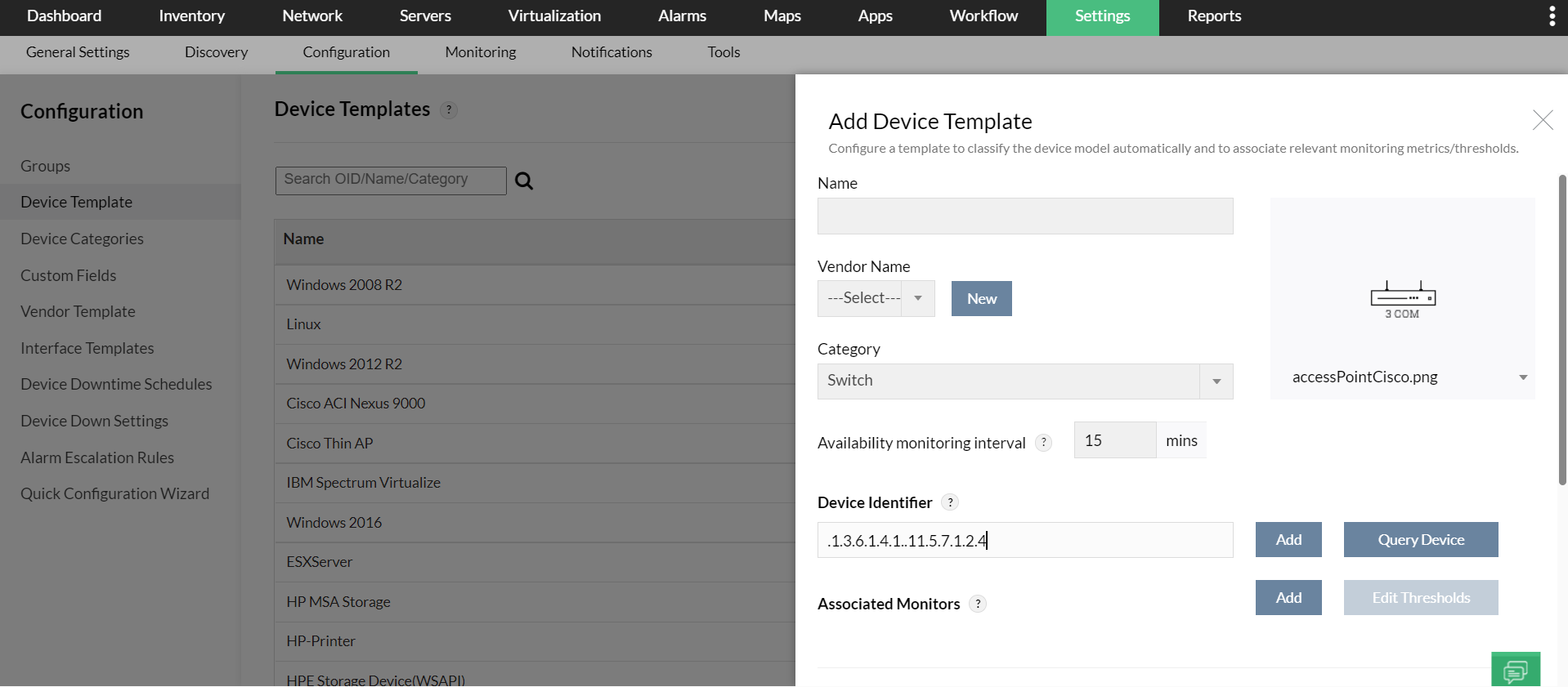 - Specify the Name for the device template, the Vendor name, the Category and the Monitoring Interval.