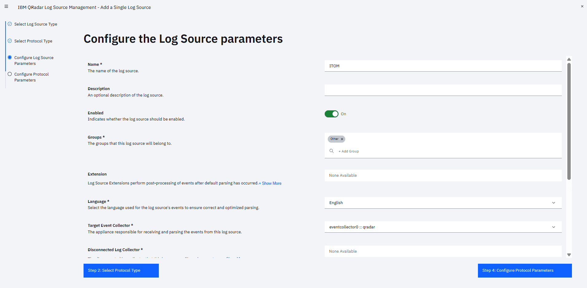 - You can configure the log sources by providing the name, description, and other fields. These fields are optional.
