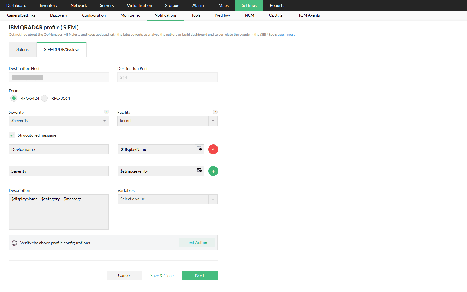 - Enter the required parameters, including Format, Severity, Facility, Description, and relevant Variables.