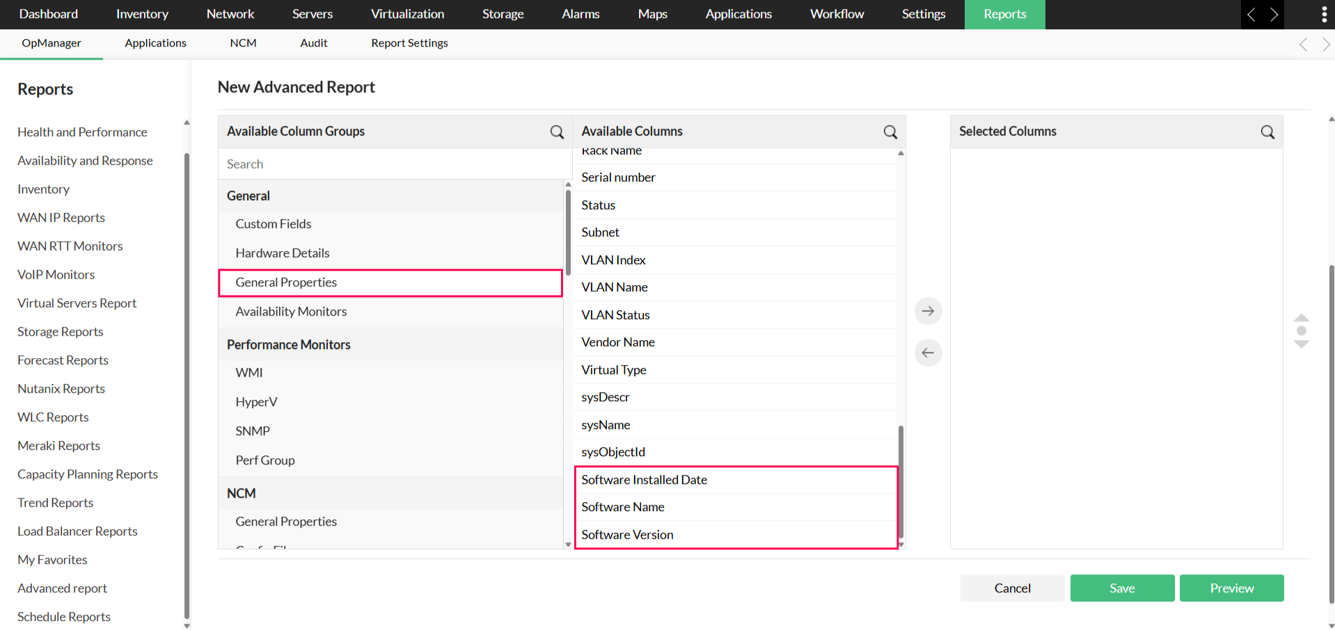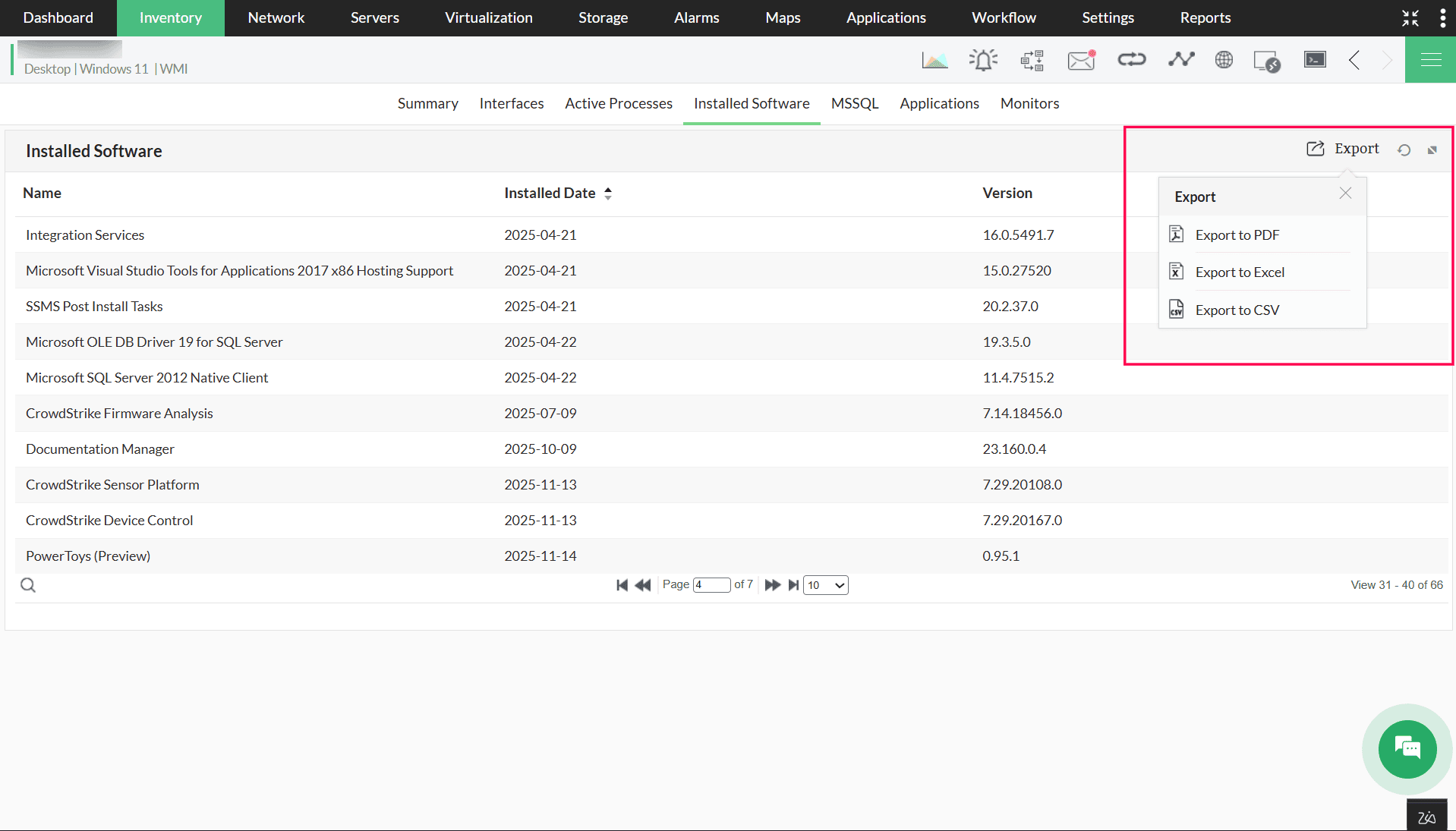OpManager updates installed software details through the scheduler at a default interval of 12 hours. You can also generate bulk exports for multiple devices through Advanced Reports, which include software name, version, and installation date.