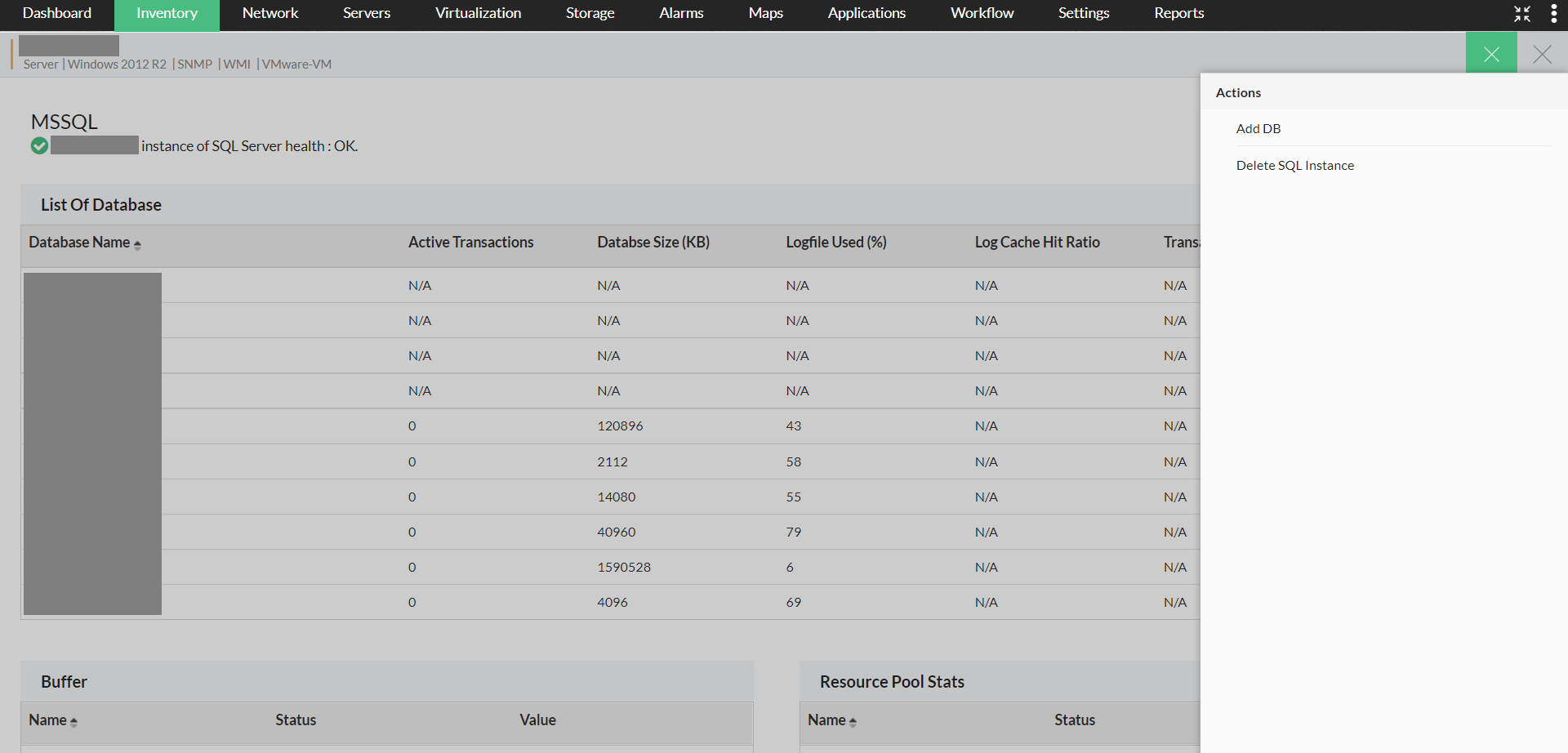 In the device snapshot page, click on the more icon found at the top-right corner of the page. Now, select "MSSQL" to view your MSSQL monitoring dashboard. By selecting a specific instance, users can view all the monitors listed, along with their buffer and resource pool stats. Furthermore, users also have the option to add and delete databases from MSSQL dashboards by clicking on the menu option at the top right corner of the page.