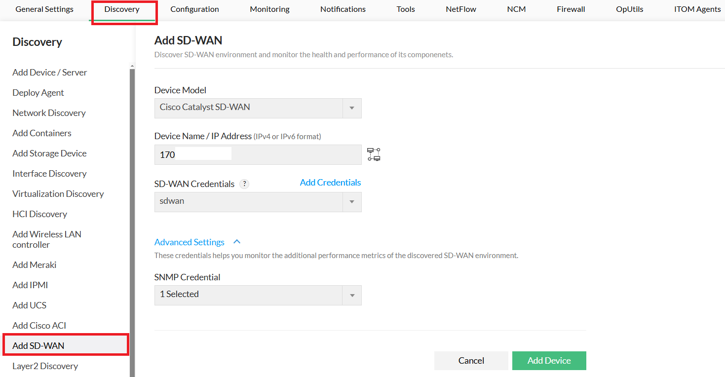 To add and monitor an SD-WAN device in OpManager, follow these steps: