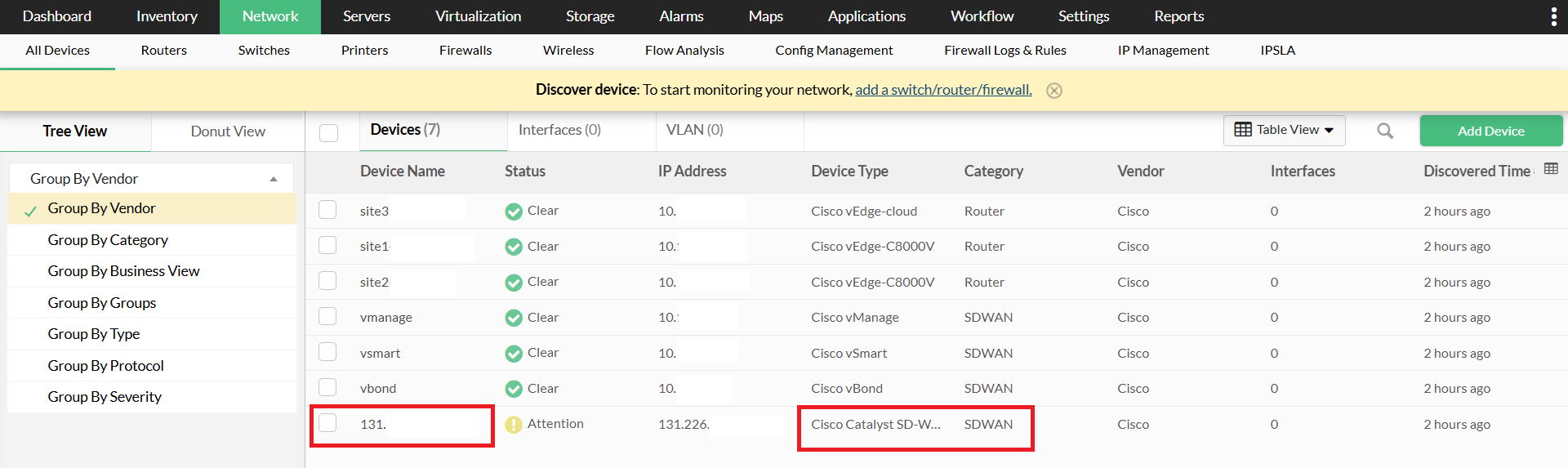 - Once discovery is complete, the controller, sites, and edge devices will be added to OpManager’s inventory.
