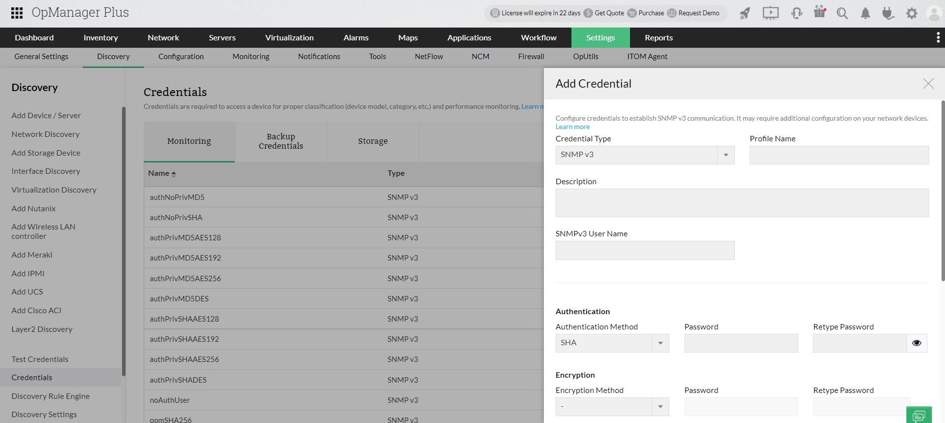 OpManager has, for long, supported the use of standard protocols like Secure Hash Algorithm (SHA-1) and Message Digest Algorithm 5 (MD5) for SNMPv3 authentication. However, considering the rapid increase in demand for secure environments and with the widely available support for SHA-2, it becomes essential for any monitoring tool to enforce this at the earliest. With such objective, OpManager has brought into effect, the use of SHA-2 authentication for SNMPv3 monitoring. The SHA-2 as a family of 2 hash functions, the SHA-256 and SHA-512, signifies a comparatively more secure monitoring of your network devices using the SNMPv3. Users can now choose either of these protocols for authentication, during configuration of credentials