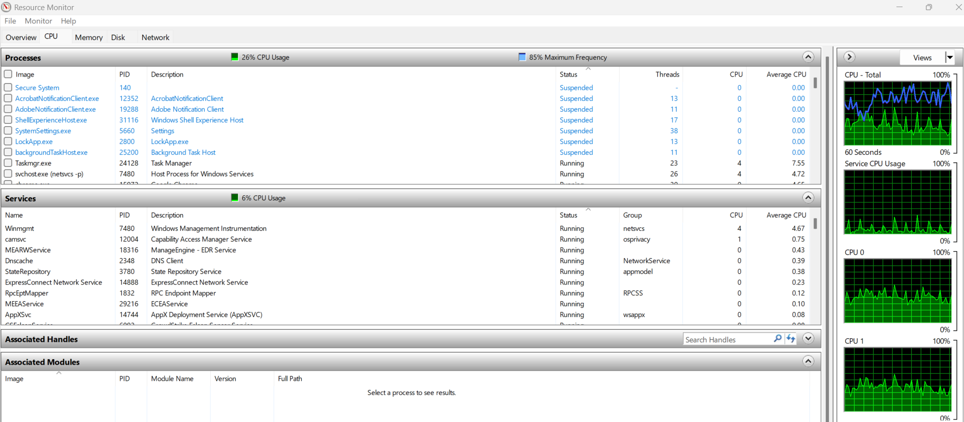 On Windows: Use the Resource Monitor (resmon) to view real-time graphs for CPU, Memory, and Disk I/O.