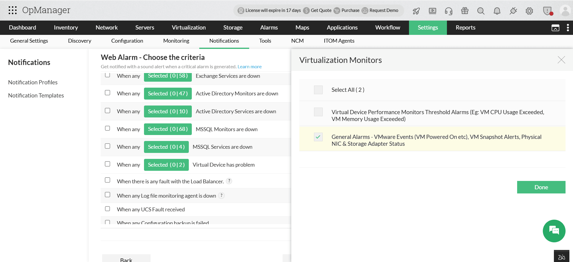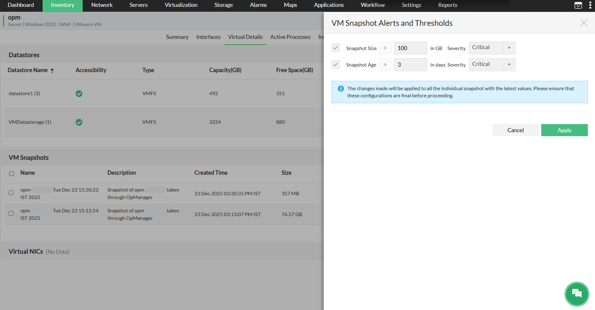 OpManager polls your vCenter or ESXi to collect snapshot metadata and delta sizes. Metrics such as snapshot age, size, datastore, and associated VM are stored and evaluated against the thresholds you configure (per VM or at the vCenter level). When a threshold is breached, OpManager raises an alarm and routes it through the configured notification profile so the right teams or automation process are notified.
