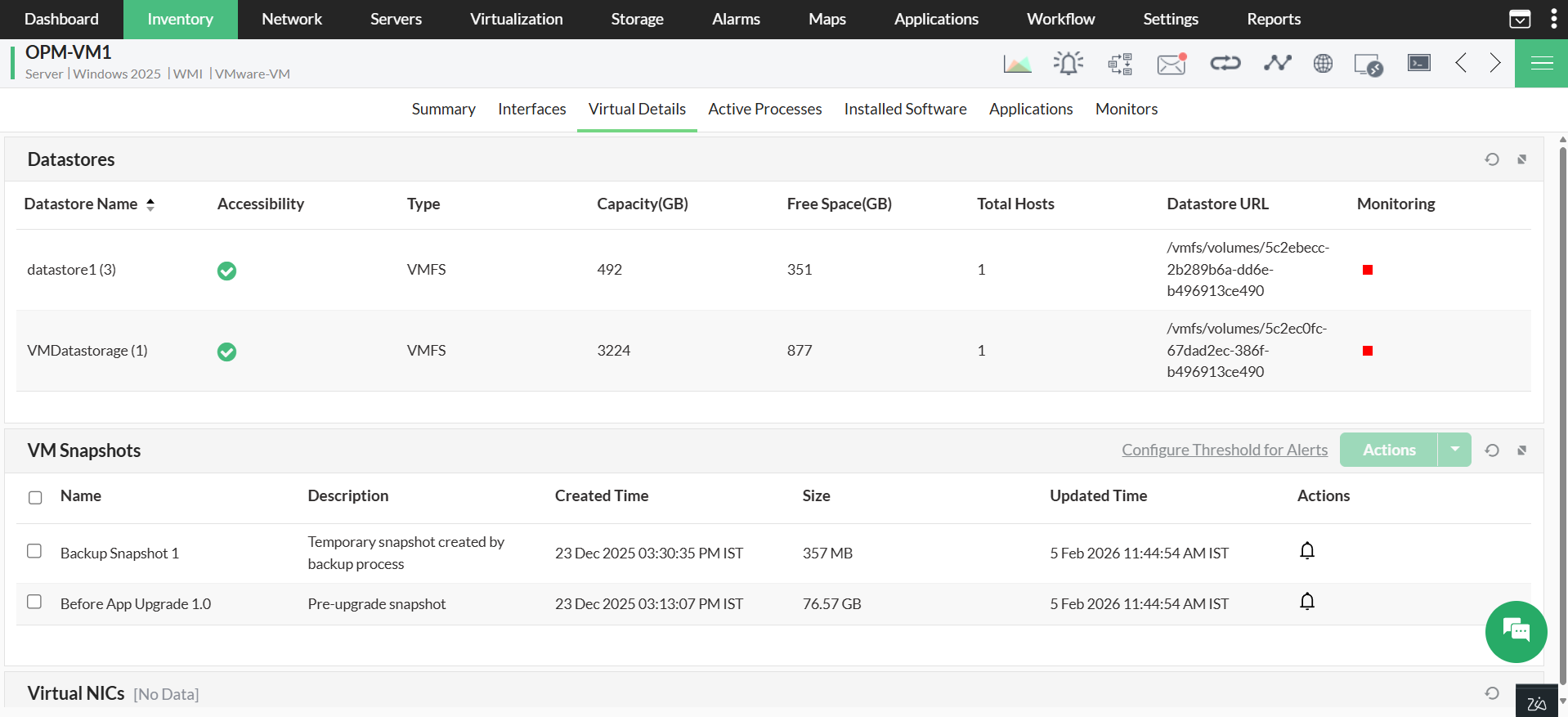 VMware snapshots are often forgotten after troubleshooting or patching, causing hidden datastore growth and performance degradation. OpManager’s VMware VM snapshot monitoring helps virtualization and infrastructure teams track snapshot age, size, and growth in real time. Snapshots are a critical component of VM management and short-term recovery, but they are not a substitute for backups—and when left unmanaged, they can quickly cause storage and performance problems. With OpManager’s VMware snapshot monitoring, you can: