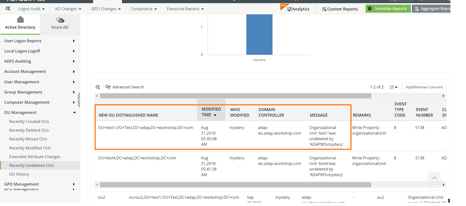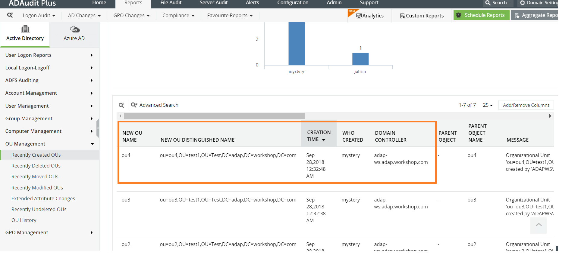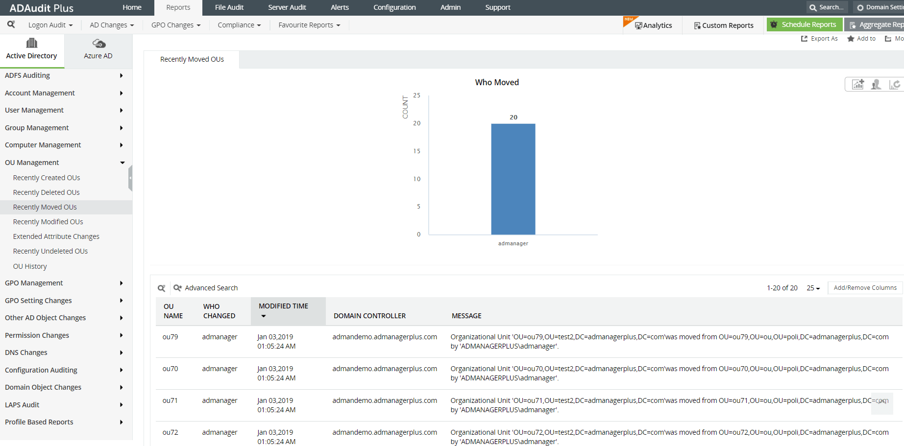 ADAudit Plus rapporteert over de geschiedenis van organisatie-eenheden, inclusief de volgende wijzigingen in organisatie-eenheden: