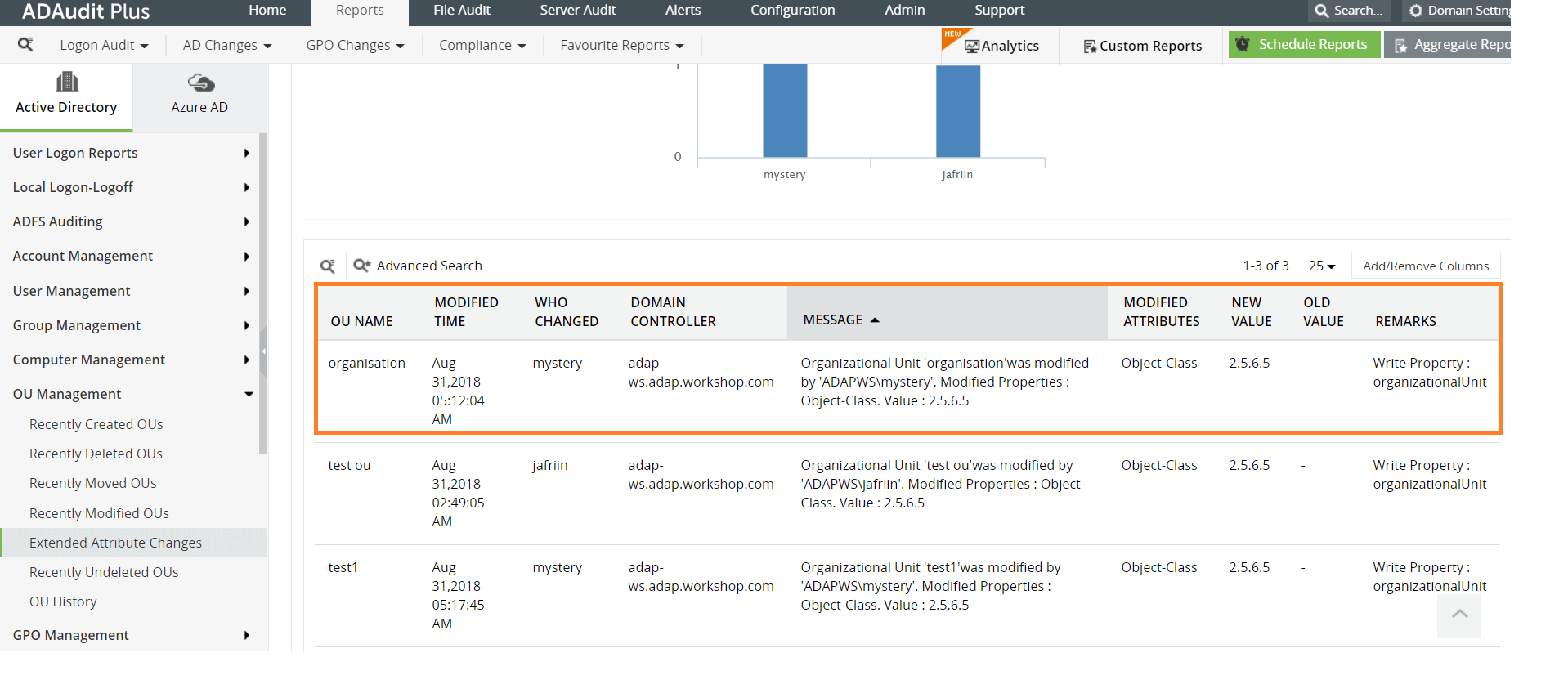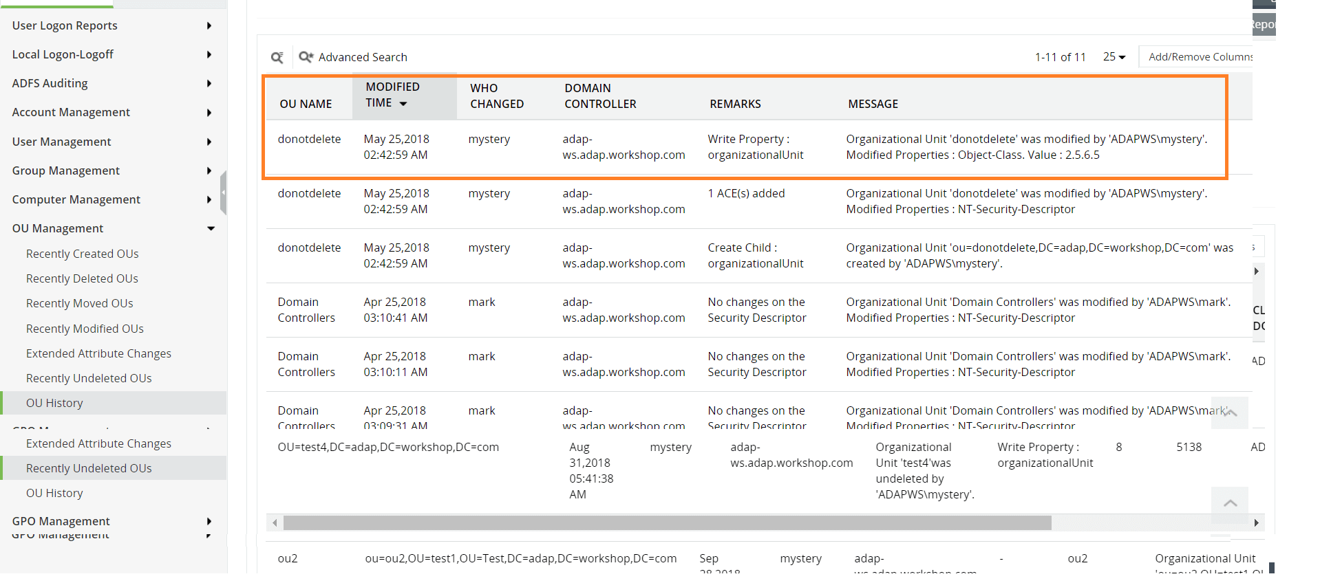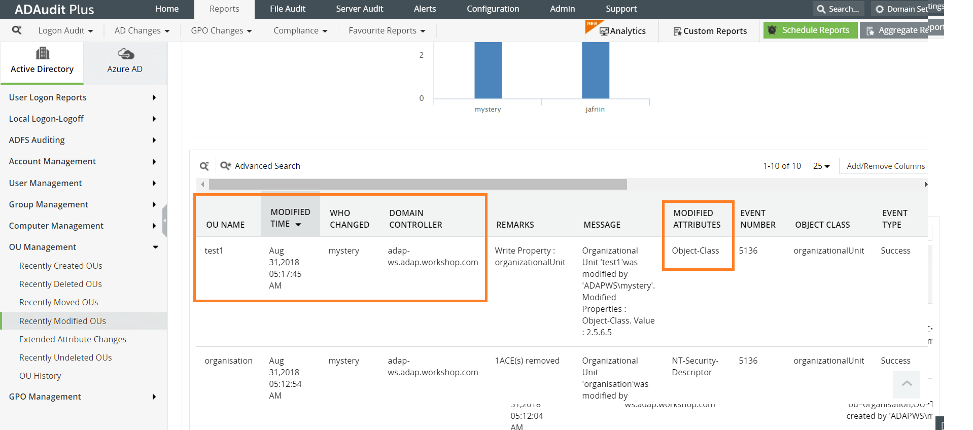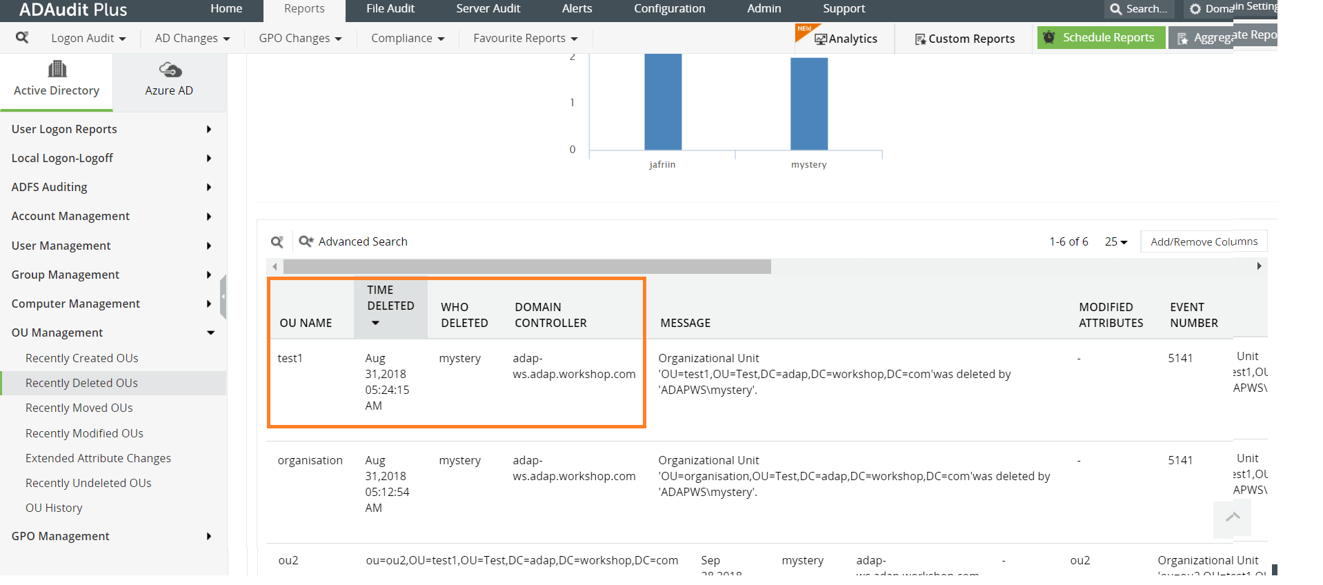 ADAudit Plus rapporteert over de geschiedenis van organisatie-eenheden, inclusief de volgende wijzigingen in organisatie-eenheden: