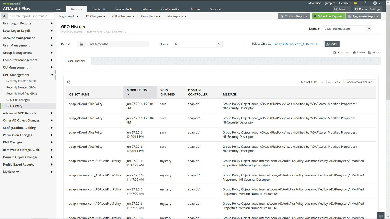 Het rapport "GPO-geschiedenis" bevat de gedetailleerde geschiedenis van wijzigingen die hebben plaatsgevonden in een geselecteerd GPO. De geschiedenis van één of meerdere GPO's in een geselecteerd domein kan worden bekeken vanuit één webinterface. Dit document of rapport fungeert als een tool / hulpmiddel om te helpen bij het diepgaand opsporen van fouten, inbraken en ander forensisch onderzoek.