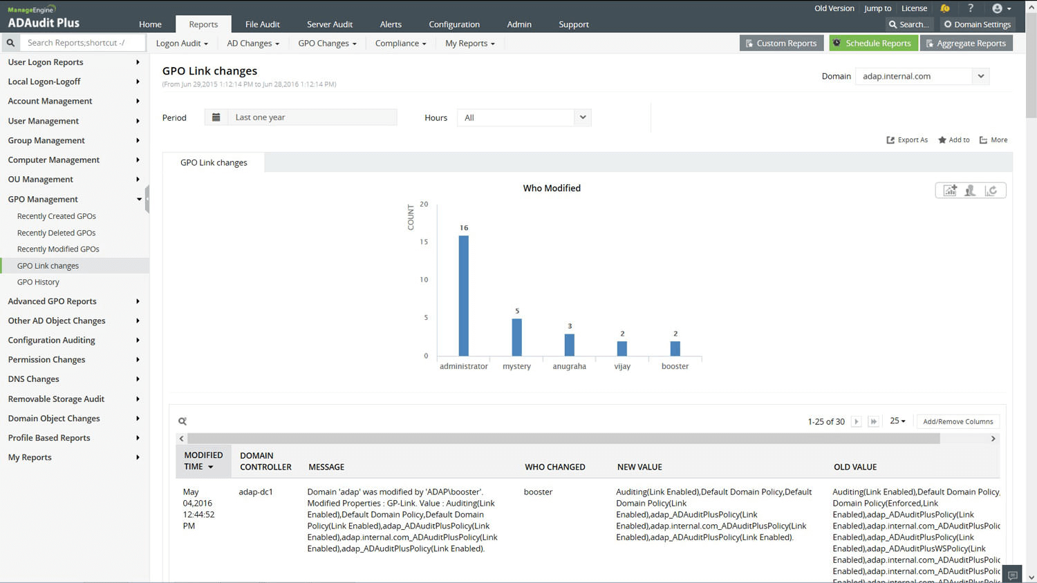 Wijzigingen in koppelingen aan een 'GPO' zal het bereik van het GPO vergroten of verkleinen. Een wijzigingen in een koppeling houdt in dat een object dat aan een GPO was gekoppeld, is verwijderd of dat er een nieuw object is toegevoegd. Deze wijziging moet onder toezicht staan, aangezien verwijdering van een niet-gecontroleerde koppeling uit het GPO betekent dat beleidsbeperkingen die ooit werden afgedwongen op gekoppelde objecten, zijn verwijderd en dit kan ertoe leiden dat configuraties van één GPO worden gerepliceerd naar andere OE's of sites. Dit is een onverwacht gedrag en er moet streng tegen worden opgetreden. ADAudit Plus biedt gedetailleerde rapporten over alle koppelingen die zijn toegevoegd of verwijderd aan groepsbeleidsobjecten en helpt bij de noodzakelijke corrigerende/corrigerende procedures.