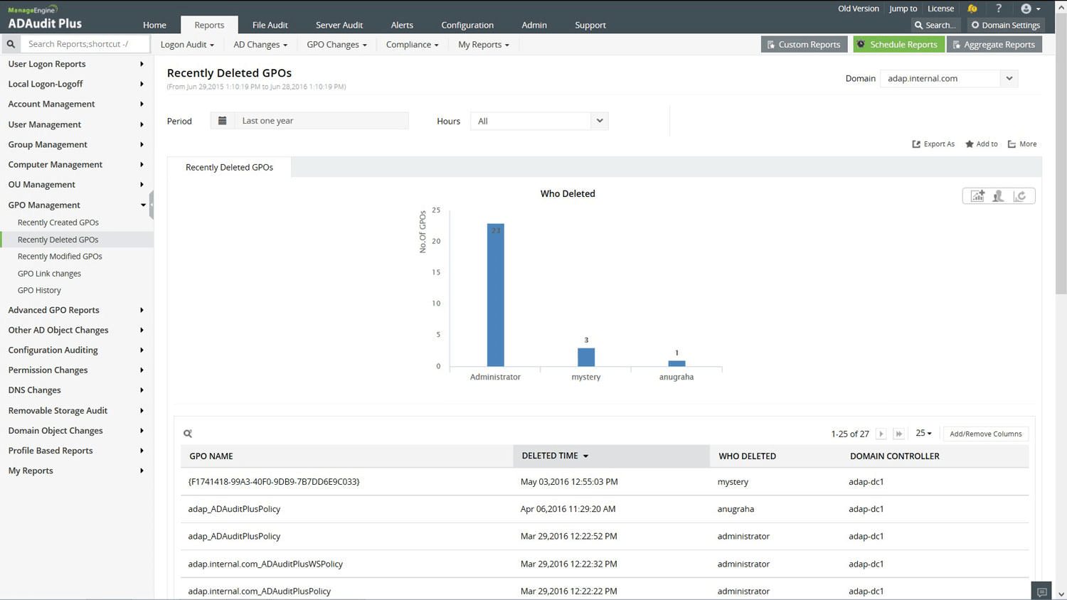 In dit rapport worden alle verwijderde groepsbeleidsobjecten vermeld. Wijzigingsgegevens zoals 'GPO-naam', 'wie heeft het verwijderd', 'het tijdstip waarop het is verwijderd', de gegevens van de domeincontroller en het bovenliggende object, worden standaard weergegeven. Een verwijderde GPO impliceert.