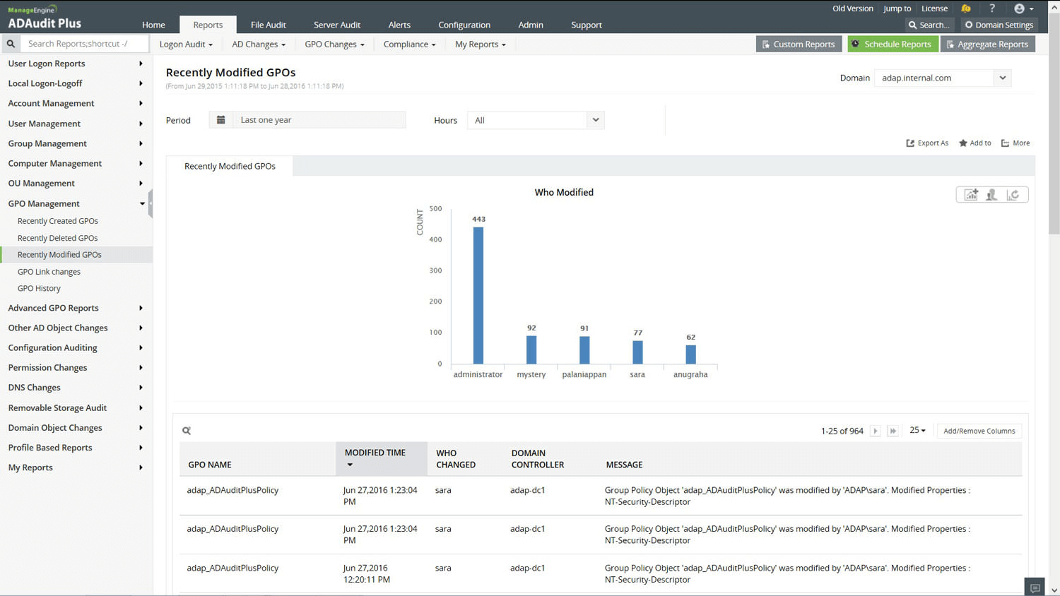 ADAudit Plus registreert alle wijzigingen die zijn aangebracht in een GPO en het "Recent gewijzigd GPO" geeft een overzicht van deze wijzigingen in handige en gemakkelijk te begrijpen rapporten. Het tijdstip van wijziging en de wijziging die aan het GPO is aangebracht, worden duidelijk weergegeven. De momenteel beschikbare rapporten tonen informatie dat er een configuratiewijziging is aangebracht in het GPO met de informatie dat GPO is gewijzigd. Gedetailleerde rapportage van configuratiewijzigingen in een GPO volgt echter binnenkort.